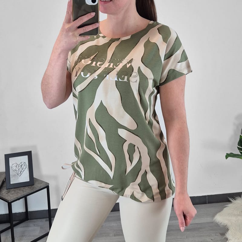Ženska majica s kratkimi rokavi v olivno zeleni in bež barvi. Narejena je iz visoko kvalitetne viskoze, zato je zelo lahka in zračna in primerna za tople poletne dni. Majica ima na sprednji strani tisk iz bleščečih kamenčkov. Kroj majice je nekoliko širši, spodaj ima vrvico, s katero lahko majico oblikujete po telesu. Na voljo je od številke 36 do 50.