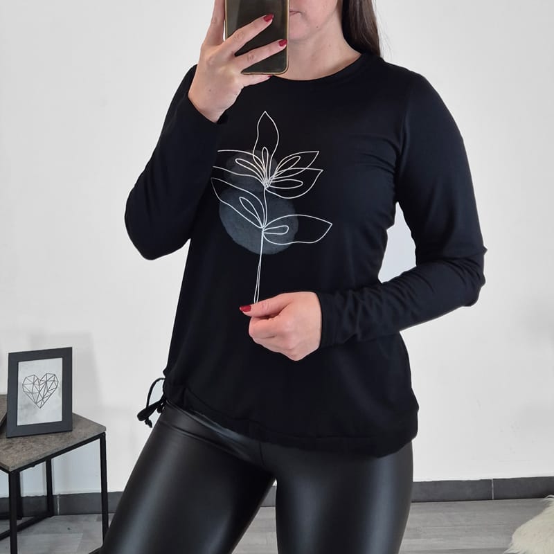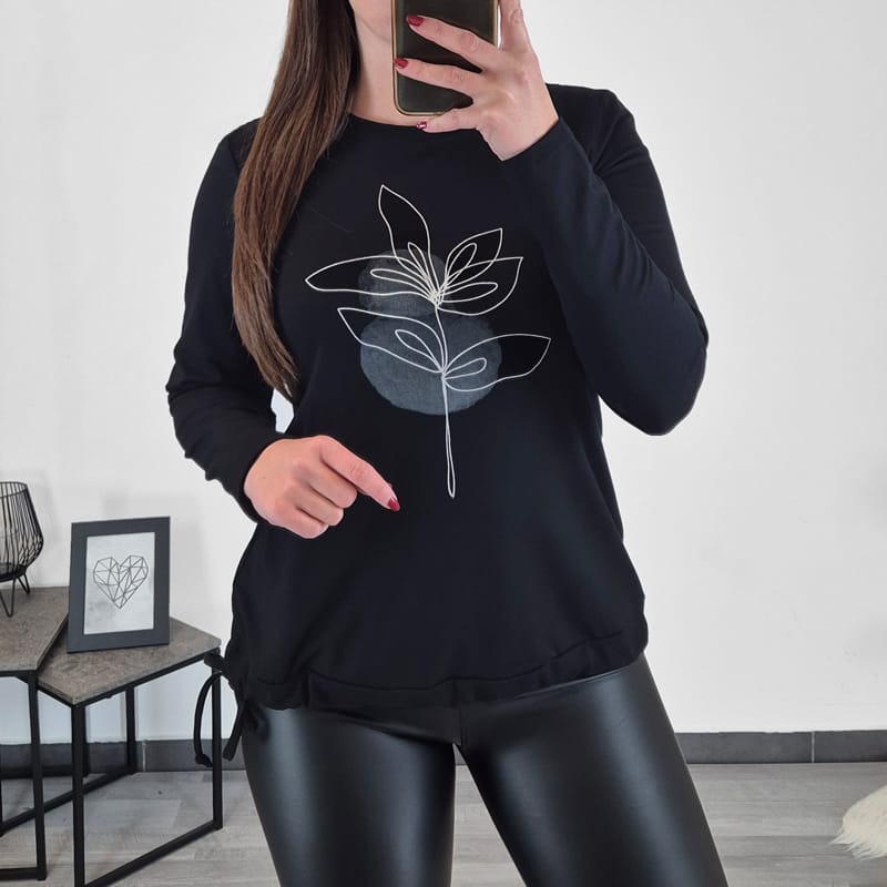 Modna majica Ajla je v črni barvi. Majica ima dolga rokava, na koncu je dodana vrvica s katero lahko prilagodite širino. Na sprednji strani jo krasi čudovit tisk. Izdelana je iz kvalitetne viskoze in je prijetna za nošenje.