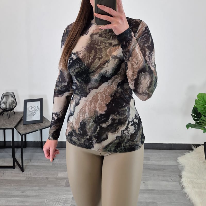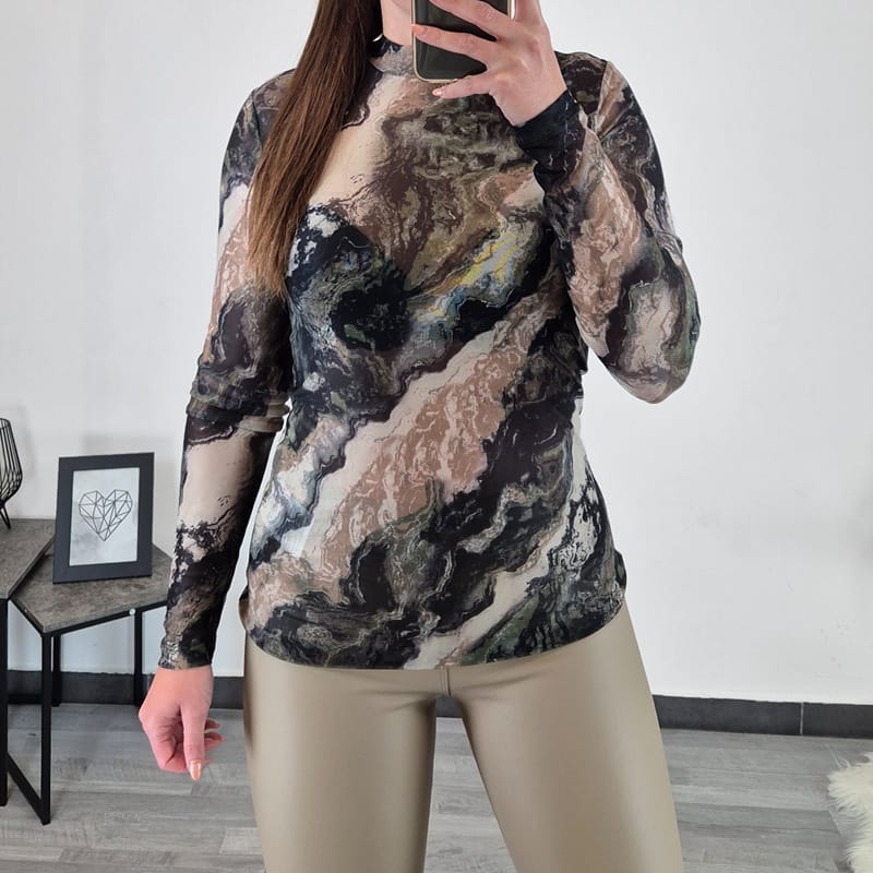 Ženska elegantna majica je narejena iz recikliranega in elastičnega poliestra. Ima zeleno – bež abstrakten vzorec, zato jo boste lahko odlično kombinirale s svojimi oblačili. Tkanina je v celoti prosojna. Na voljo je od številke S do 2XL. Majica je lahko odlična popestritev vašega outfita.
