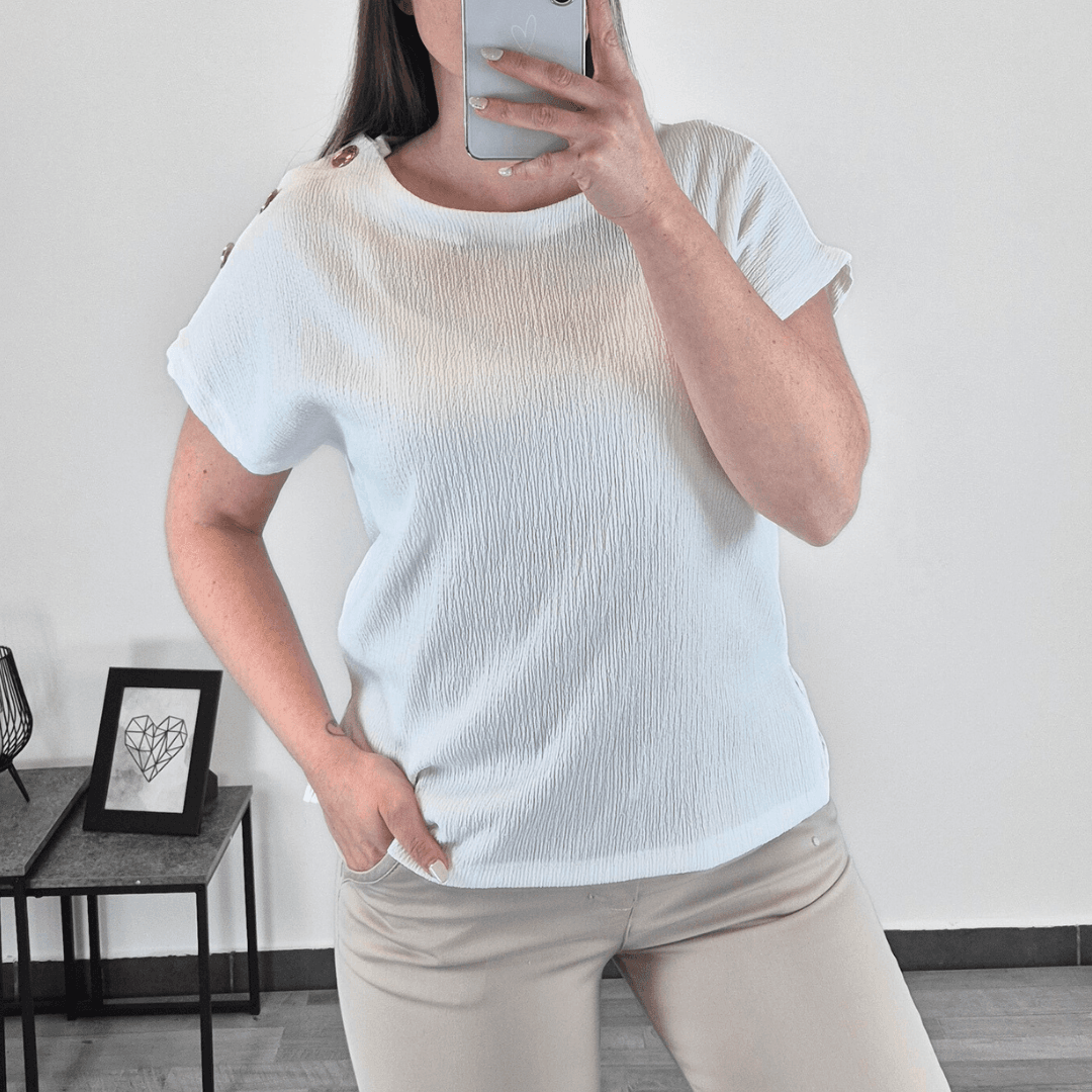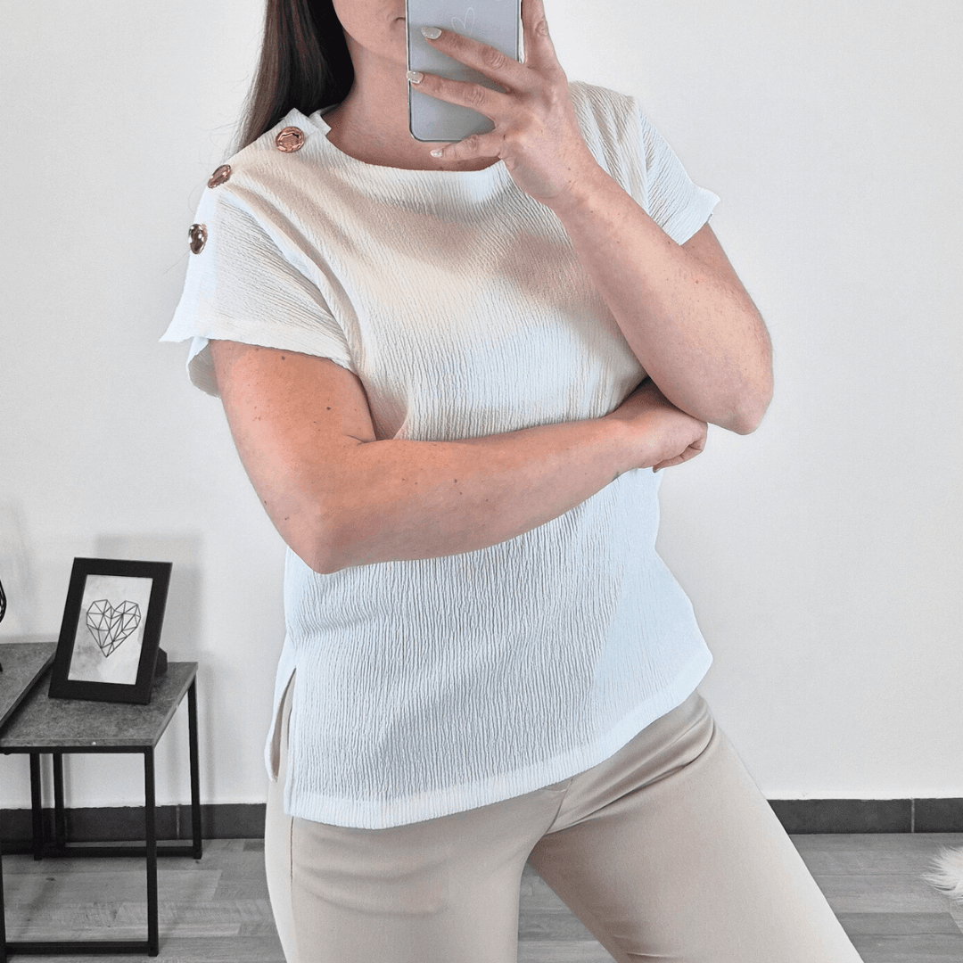 Ženska elegantna majica s kratkimi rokavi v barvi smetana. Majica ima na rami dodane gumbe z zlati barvi. Na voljo od številke XS do XL.
