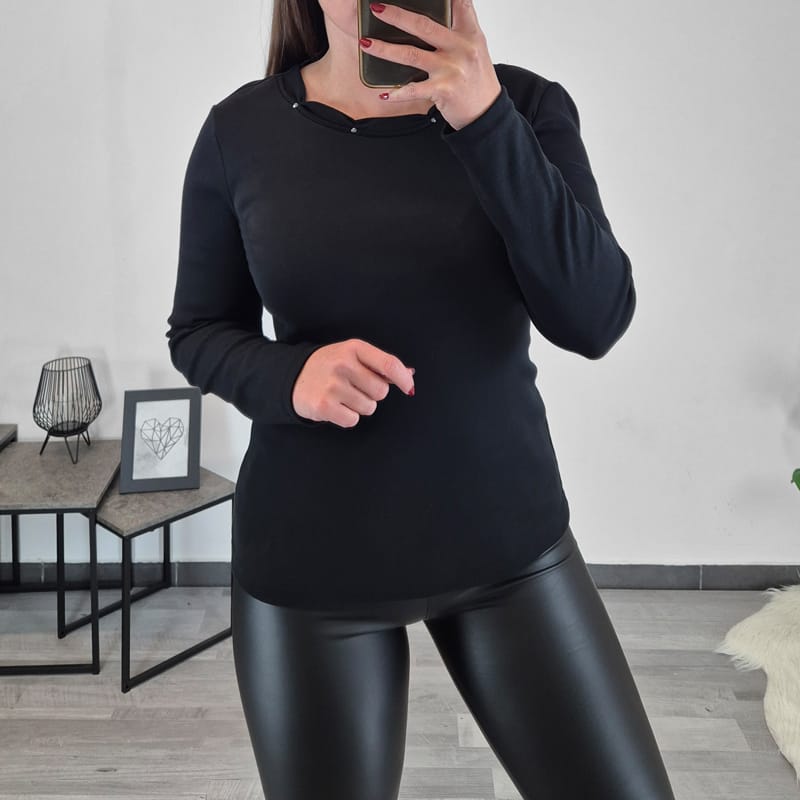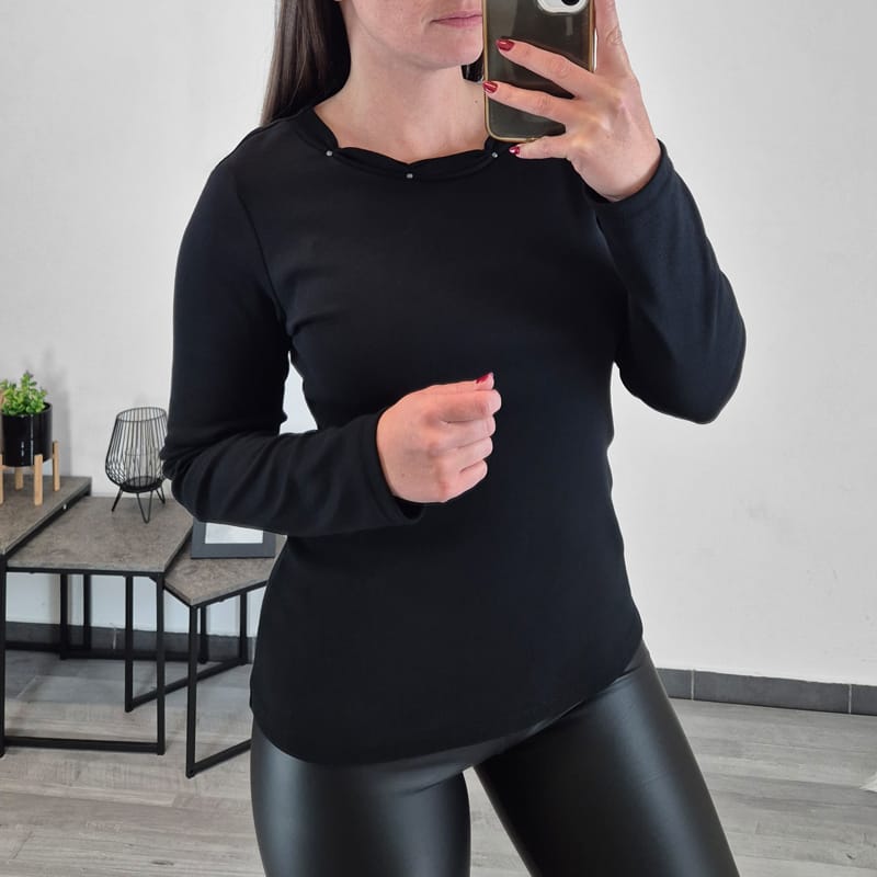 Modna majica Eva v črni barvi. Majica ima dolga rokava in čudovit izrez na sprednji strani, kjer so dodani še črni biserčki. Izdelana je iz kvalitetnega 100% bombaža in je prijetna za nošenje.