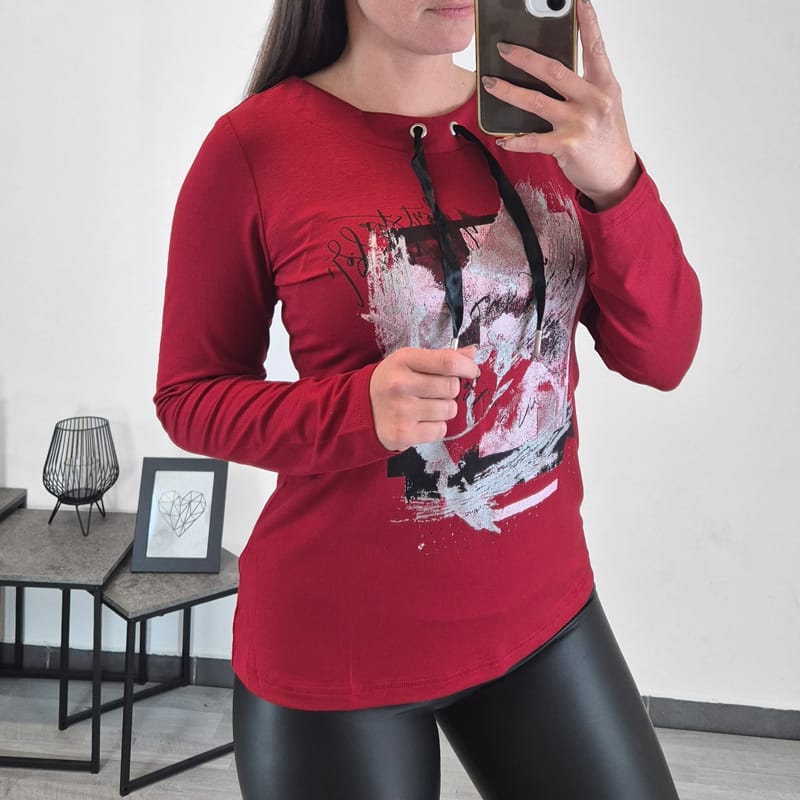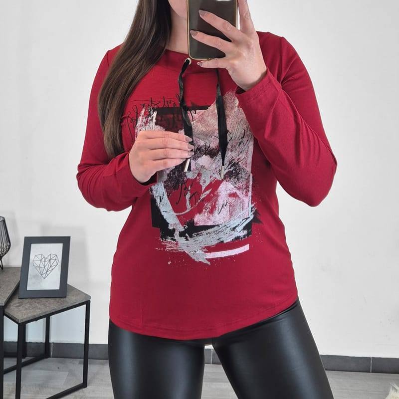 Modna majica Gaja v rdeči barvi. Ima dolga rokava, na sprednji strani je dodan tisk. V zgornjem delu majice je kot dekoracija dodan črn trak. Izdelana je iz kvalitetne viskoze in je prijetna za nošenje. V kolikor ste med številkama, priporočamo nakup večje.