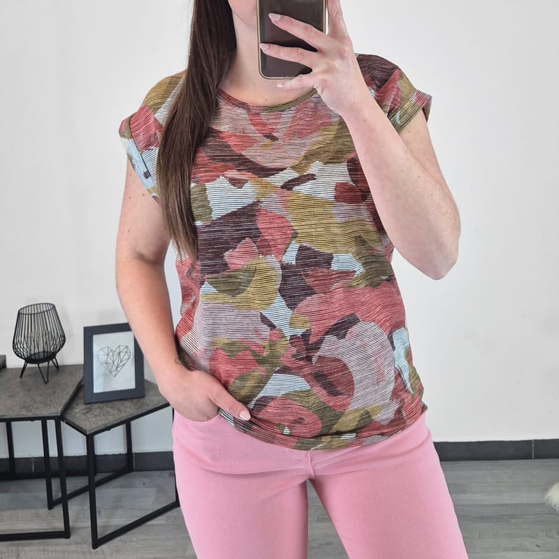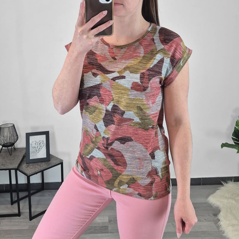 Ženska športno elegantna majica je narejena iz vzorčaste tkanine, v odtenkih bordo, bež in zelene barve. Kroj majice je raven. Ima kratka rokava. Narejena je iz mešanice viskoze in je zato prijetna za nošenje. Lepo jo boste kombinirale na enobarvne hlače ali krilo.