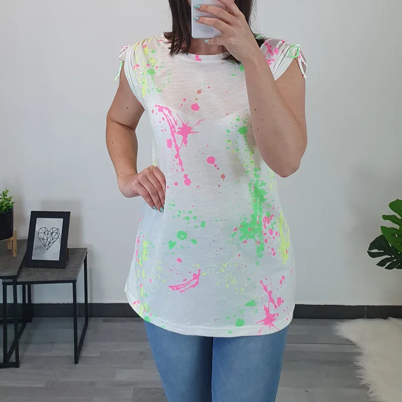 Ženska bombažna majica je v beli barvi, krasijo jo packe v različnih barvah. Kroj je malenkost širši, ima kratka rokava, dodana je še vrvica, s katero lahko prilagodite obliko. Na voljo je od številke 42 do 48.