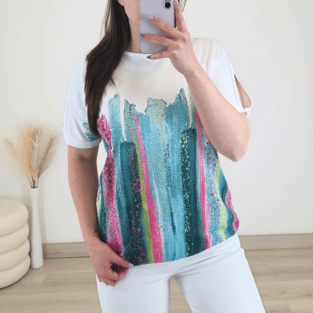 Ženska majica priznane blagovne znamke Kenny S. Majica je bele barve, na spodnjem delu je pisana. Kroj majice je širši in lepo pade. Majica ima kratka rokava, ki so prerezana. Na spodnjem delu je dodana elastika. Narejena je iz mešanice bombaža in modala, zato je mehka na otip in prijetna za nošenje. Na voljo v velikosti od 36 do 44.