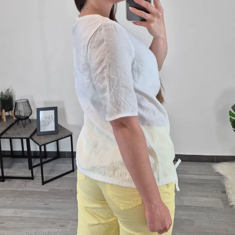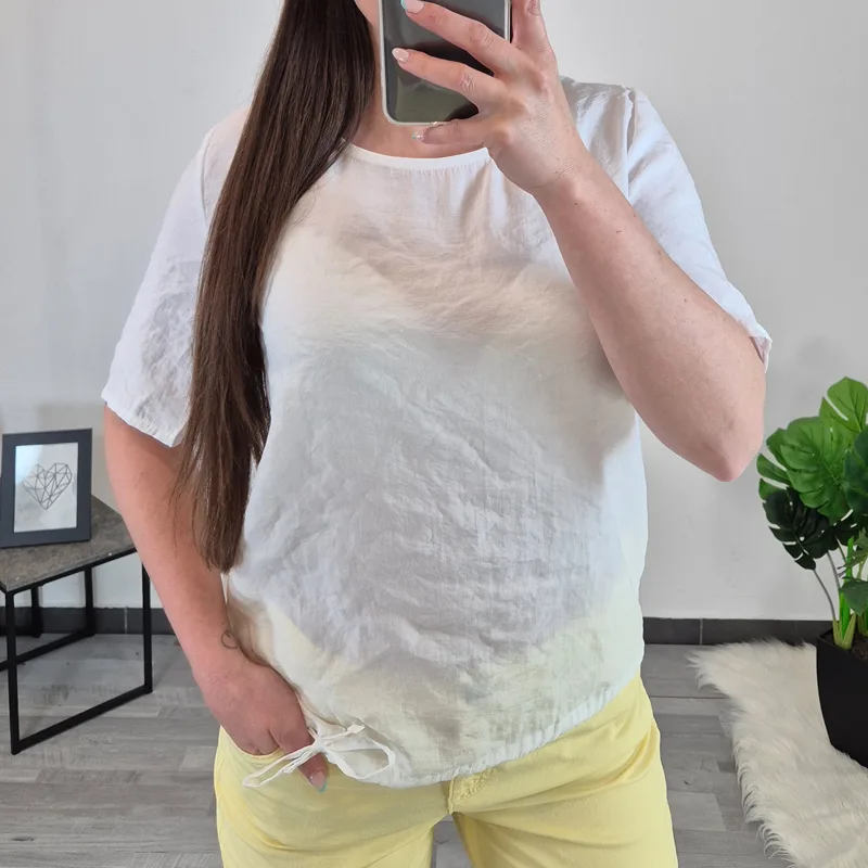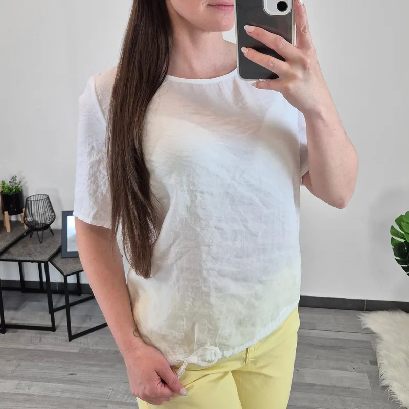 Ženska bluza znamke Kenny S. v beli barvi, v videzu zmečkanke. Kroj majice je širši, zato lepo pade po telesu, na koncu je prišita vrvica, s katero lahko majico oblikujete po svoji postavi. Bluza je izdelana iz kvalitetne mešanice modala in viskoze, je lahka in zračna. Na voljo je od številke 36 do 48.