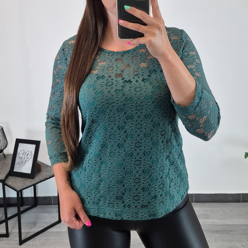 Ženska majica v s 3/4 rokavi. Majica je narejena iz čipkastega materiala v zeleni barvi, na spodnjem delu je prišit viskozni top. Majica je elegantna, lahko jo boste kombinirale s svojimi najljubšimi hlačami.