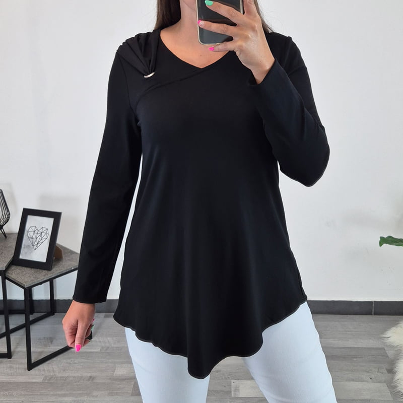 Ženska elegantna majica z dolgimi rokavi v črni barvi. Majica je narejena iz viskoze, je asimetrična in krojena na ‘A’, kar pomeni, da je v prsih ožja in spodaj širša. Ima ‘V’ izrez, ob izrezu pa sta dodana til in srebrn net, kar majico naredi posebno. Majica je krojena do velikosti 52.