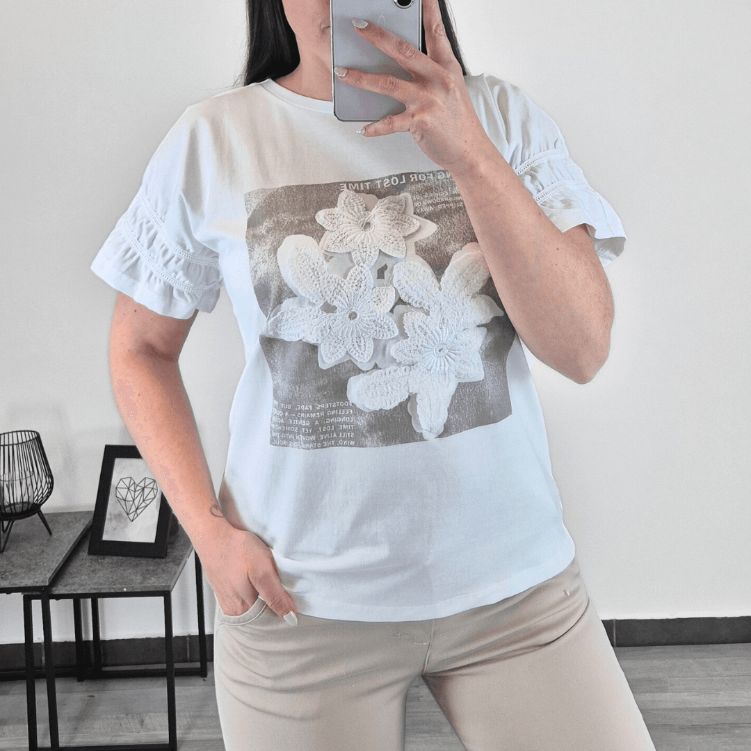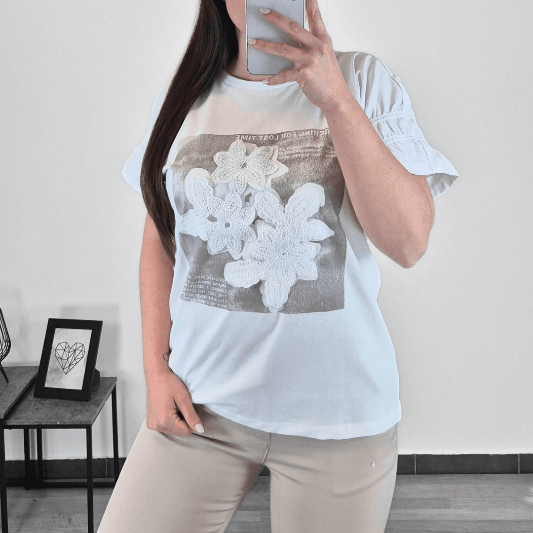 Ženska bombažna majica s kratkimi rokavi v beli barvi. Majica ima na sprednji strani tisk v bež barvi v kombinaciji z rožo iz vezenine. Na voljo od številke XS do XL.