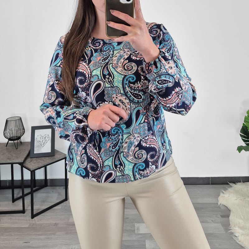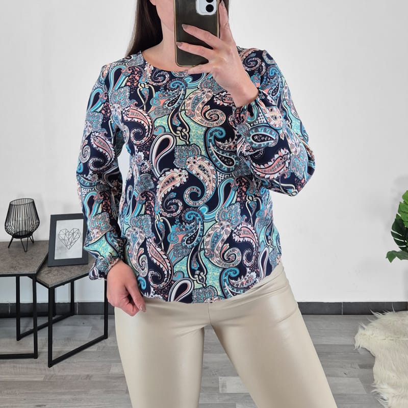 Modna ženska pisana majica. Majica ima dolga rokava in je zaključena z elastiko. Izdelana je iz mešanice viskoze in je prijetna za nošenje. Na voljo je od številke 36 do 44.