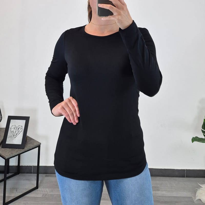Ženska tanka majica v črni barvi. Izdelana je iz liocela in elastana, je mehka na otip in je udobna za nošenje. Majica ima dolga rokava. Na voljo je od številke S do XXL.