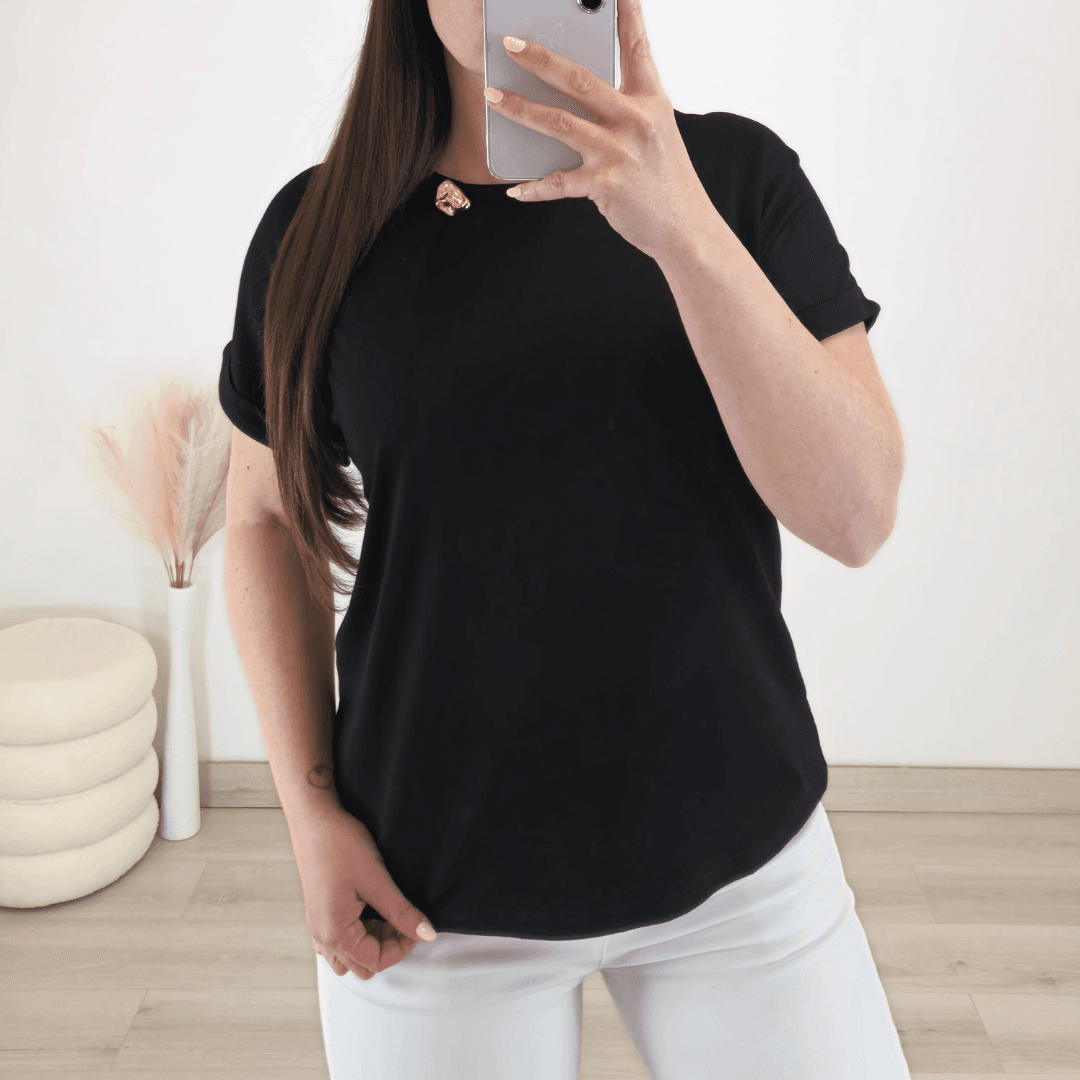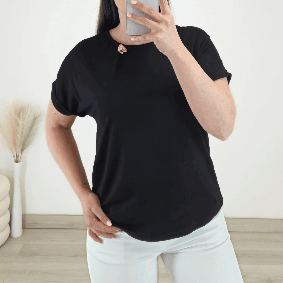 Modna ženska majica s kratkimi rokavi. Majica je narejena iz mešanice viskoze zato je mehka na otip in lepo pade. Ob ovratniku je dodana broška v zlati barvi. Na voljo je v velikostih od 38 do 48.
