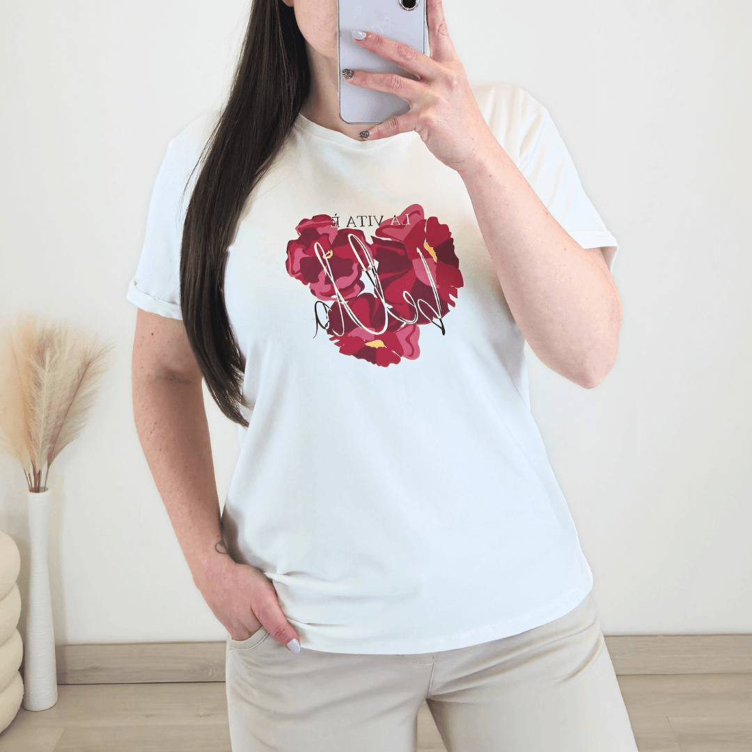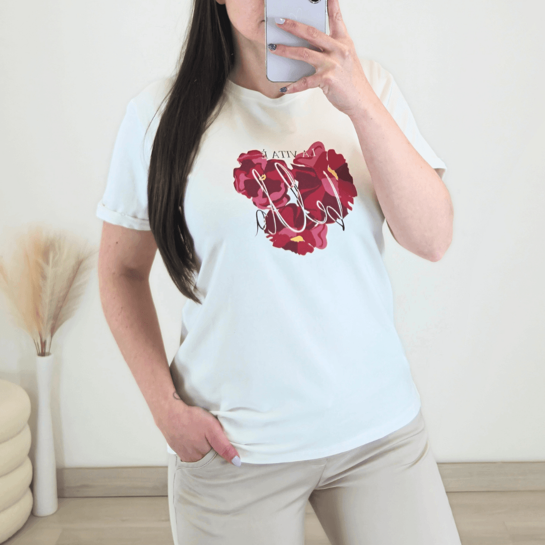Ženska majica s kratkimi rokavi v beli barvi. Majica je izdelana iz bombaža in je prijetna za nošenje. Spredaj ima tisk. Na voljo so velikosti od 40 do 48.