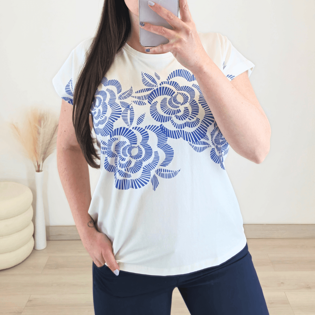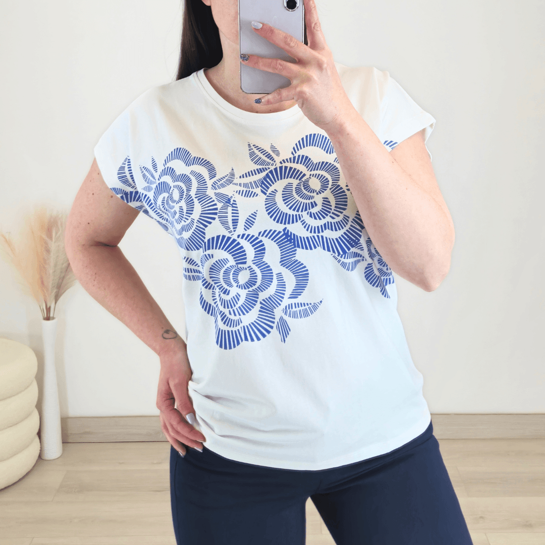 Ženska majica s kratkimi rokavi v beli barvi. Majica je izdelana iz bombaža in je prijetna za nošenje. Spredaj ima tisk. Majica je širša, če ste med velikostnimi številkami, priporočamo nakup manjše. Na voljo so velikosti od 40 do 48.