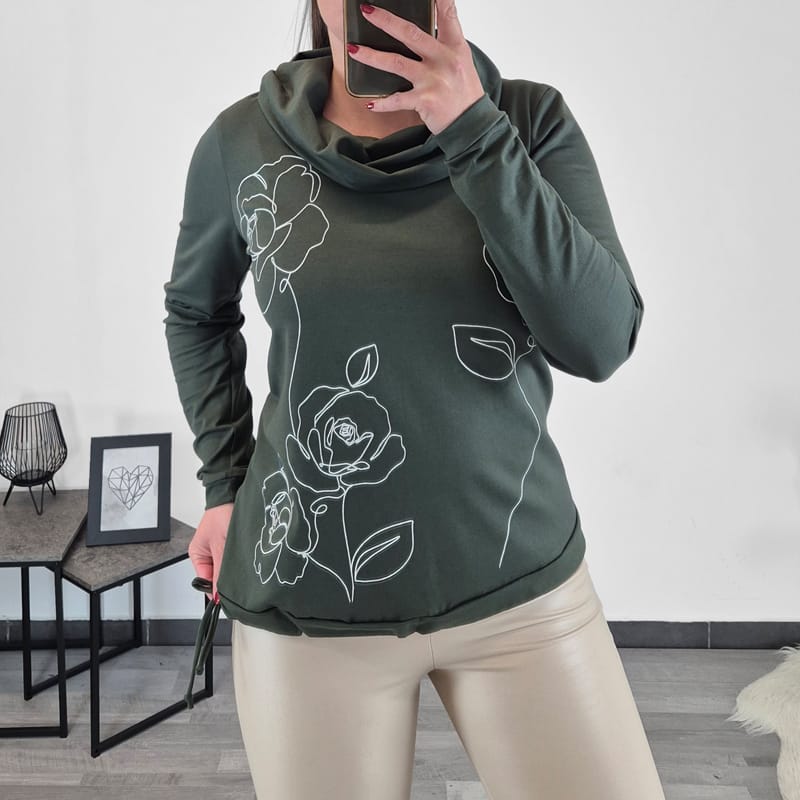 Modna majica Mirae v olivno zeleni barvi. Na sprednji strani jo krasi čudovit bel tisk cvetic. Majica ima dolga rokava in visok ovratnik. Spodaj je dodana vrvica, s katero lahko poljubno nastavite širino. Izdelana je iz kvalitetnega bombaža in je prijetna za nošenje.