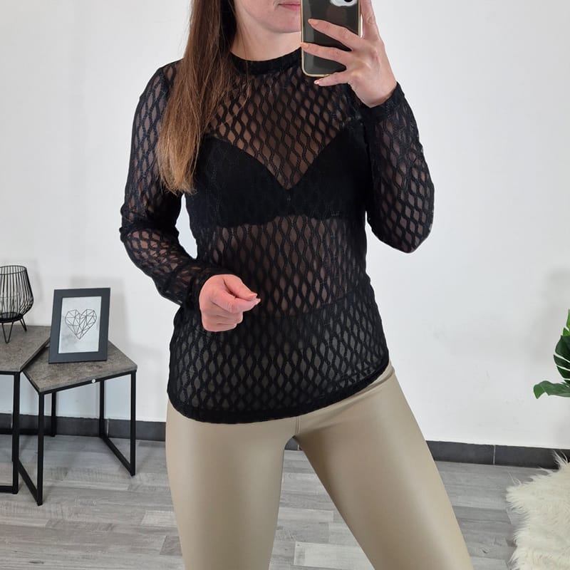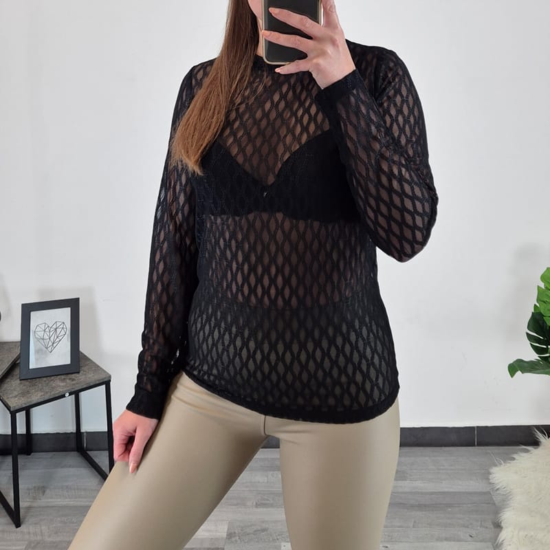 Ženska elegantna majica Nidine je narejena iz recikliranega in elastičnega poliestra. Majica ima črno prosojen vzorec, zato bo odlična izbira za različne svečane priložnosti. Tkanina je v celoti prosojna. Na voljo je od številke S do 2XL.