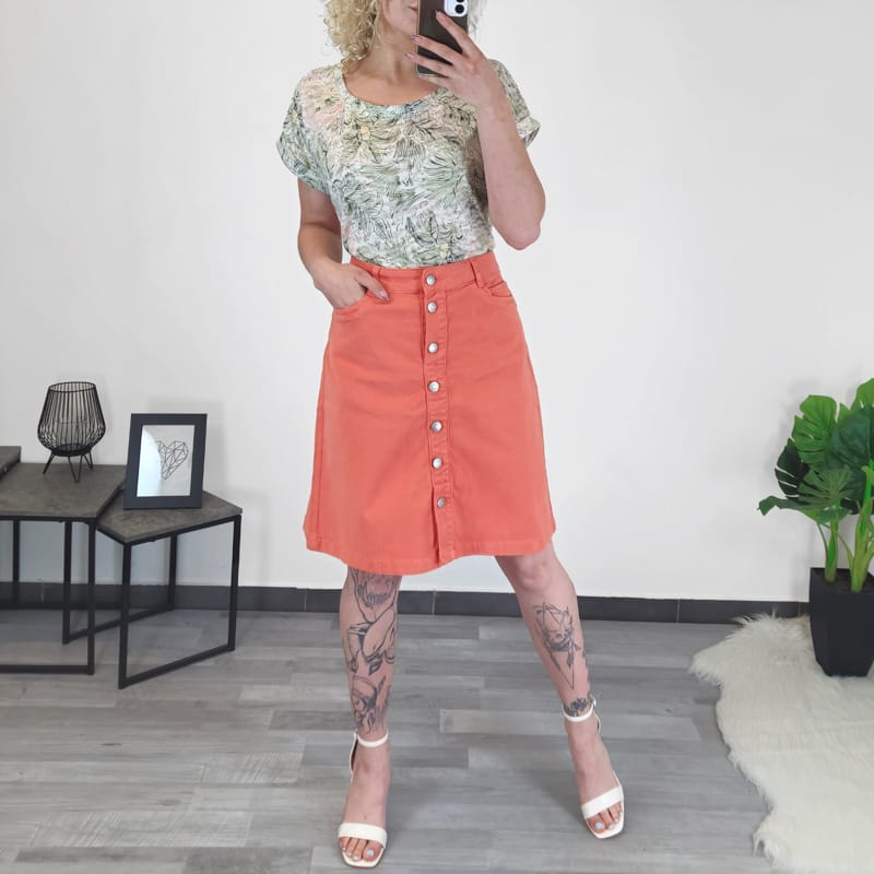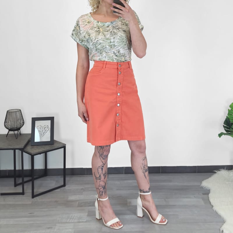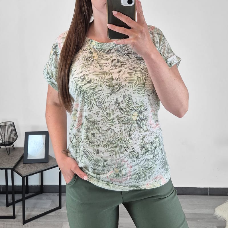 Modna majica s kratkimi rokavi. Majica je v kombinaciji zelene, bež in oranžne barve. Izdelana je iz mehkega materiala in je prijetna za nošenje.