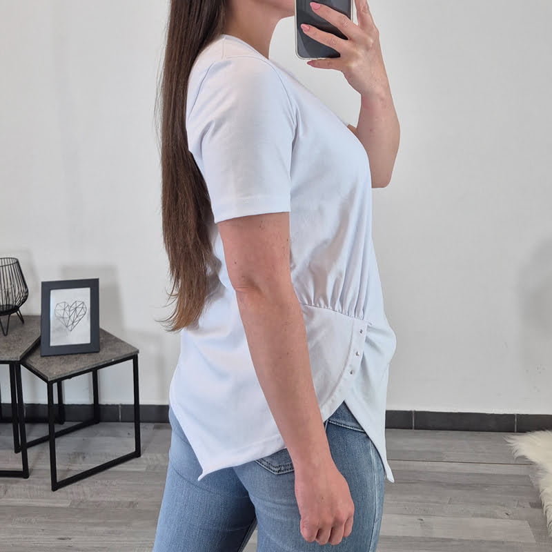 Modna majica Riana v beli barvi. Majica ima kratka rokava in je asimetričnega kroja. Na sprednji strani ima razporek in dodane tri srebne kamenčke. Izdelana je iz kvalitetnega bombaža in je prijetna za nošenje. Na voljo od številke 36 do 50.