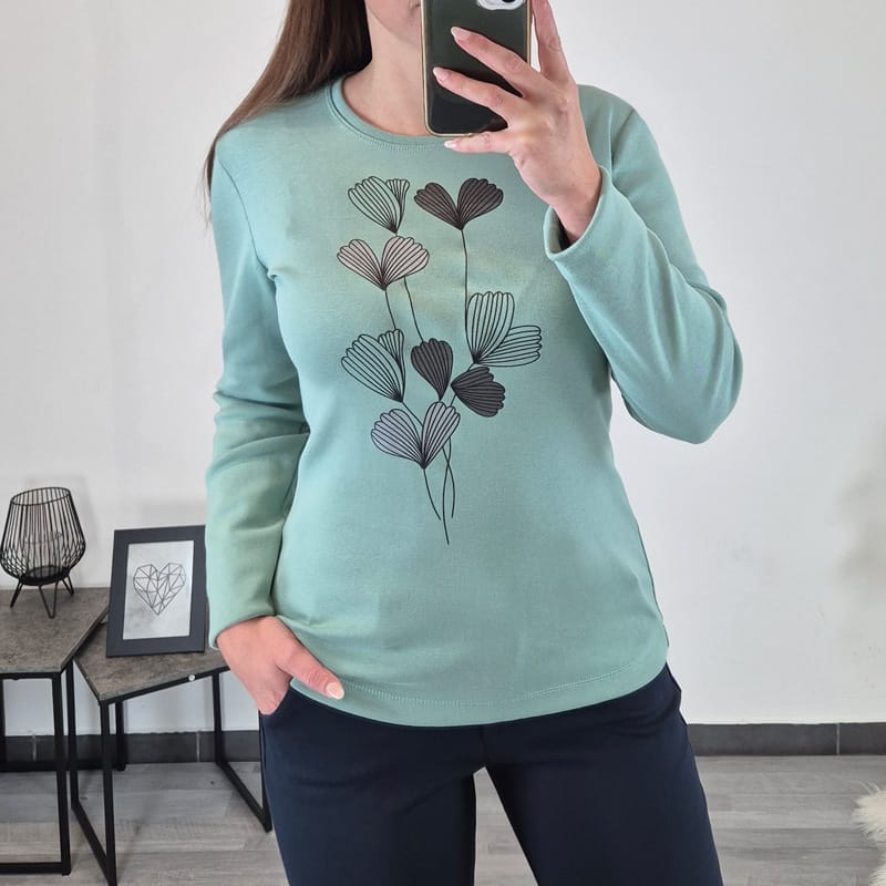 Ženska majica Tina v zeleni barvi. Majica ima dolga rokava in je rahlo oprijetega modela. Izdelana je iz kvalitetnega 100% bombaža in je udobna za nošenje. Na sprednji strani jo krasi tisk. Na voljo je od številke 38 do 50.
