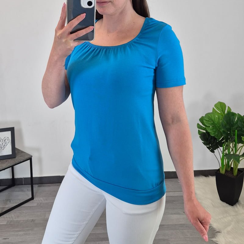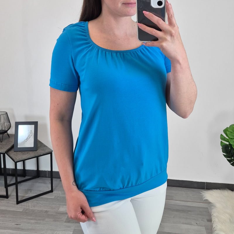 Poletna bombažna majica Valka v modri barvi. Majica je nekoliko širšega kroja, na spodnjem delu je dodan patent, ki se lepo prilega telesu. Izdelana iz kvalitetne mešanice bombaža in elastana. Majica ima okrogel ovratnik z všito elastiko. Na voljo je od številke 36 do 48.
