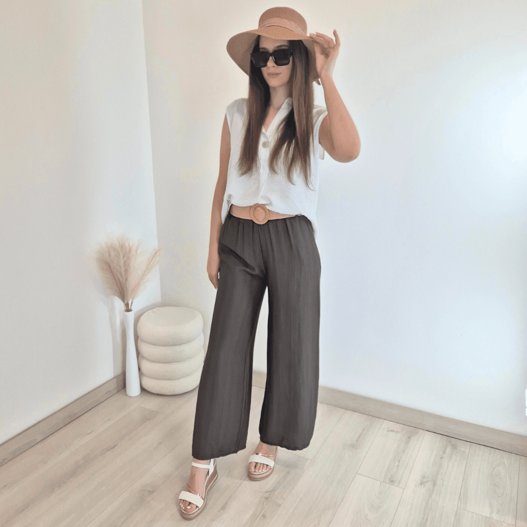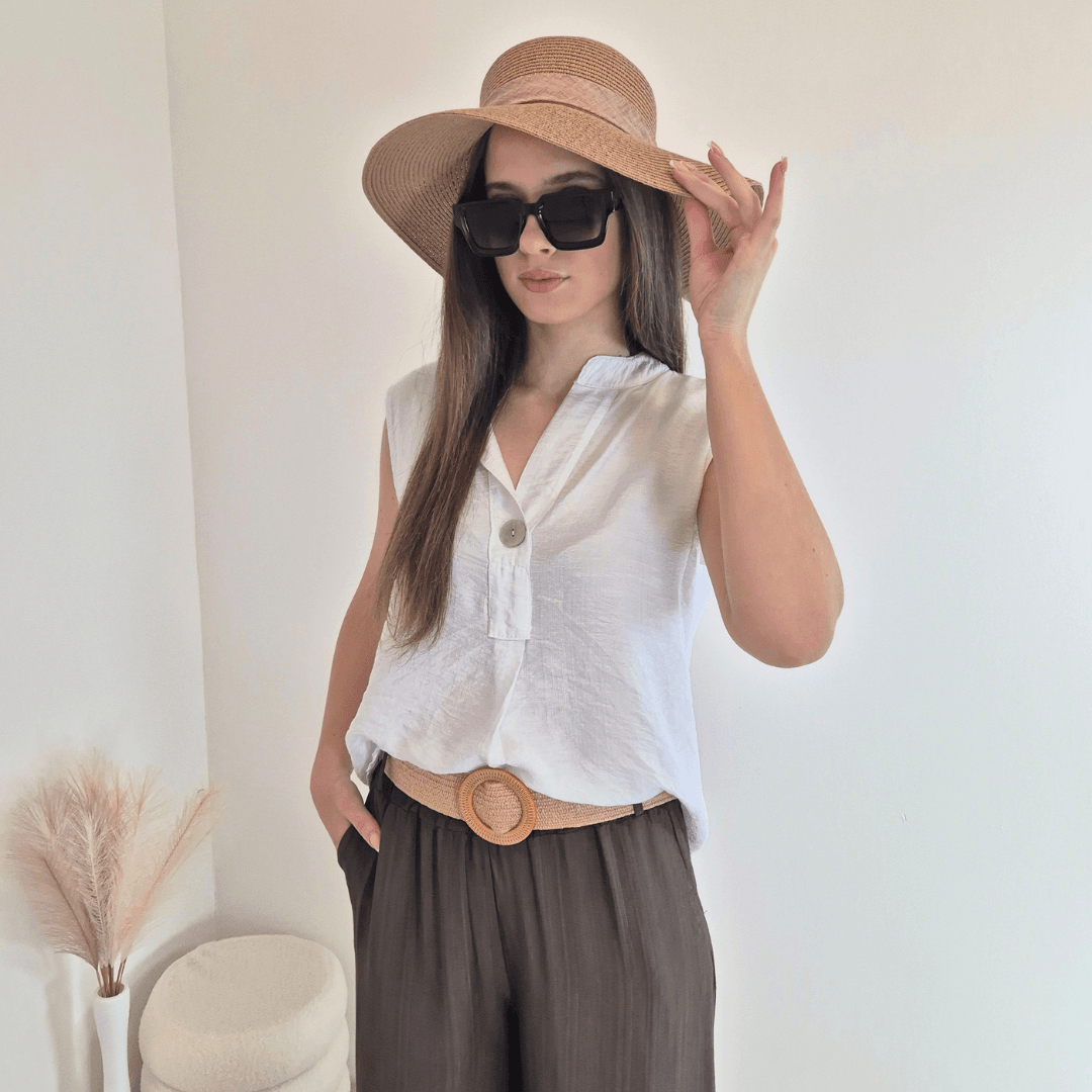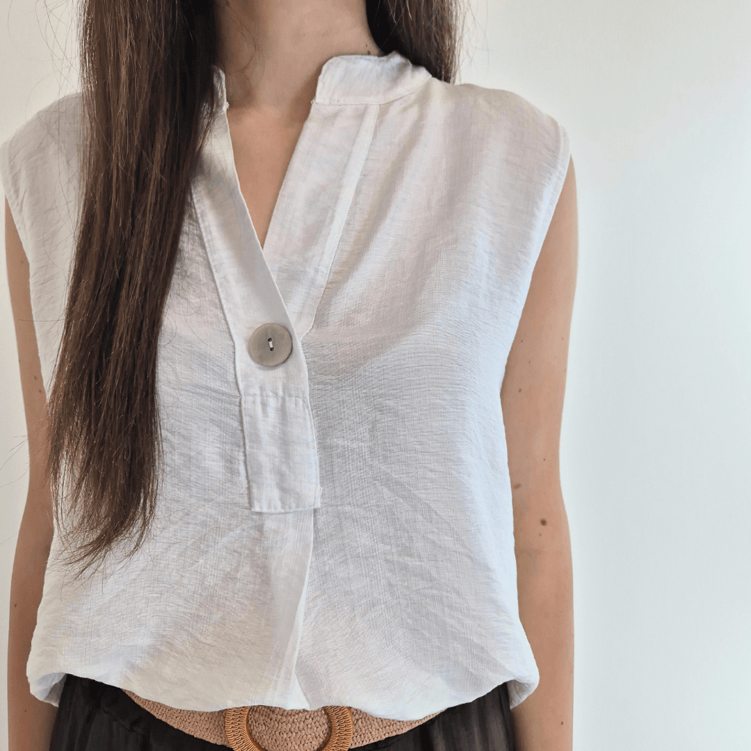 Modna ženska majica iz kolekcije Violeta v beli barvi. Majica je brez rokav in ima V izrez, ki ga krasi rjav gumb. Na zadnji strani je podaljšana. Izdelana je iz viskoze, je lahka in diha. Velikost je univerzalna, primerna za M do XXL. Vse kose iz kolekcije Violeta lahko med sabo lepo kombinirate.
