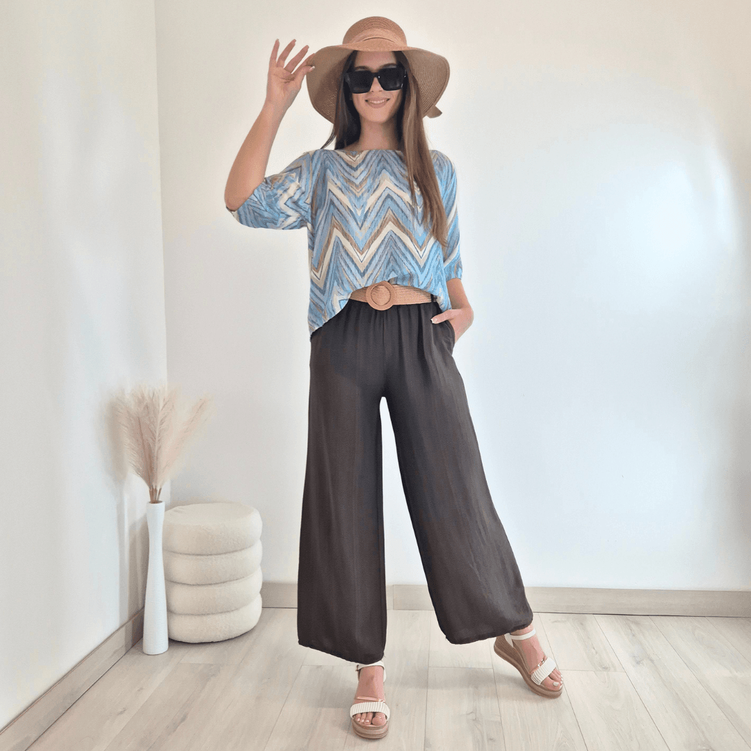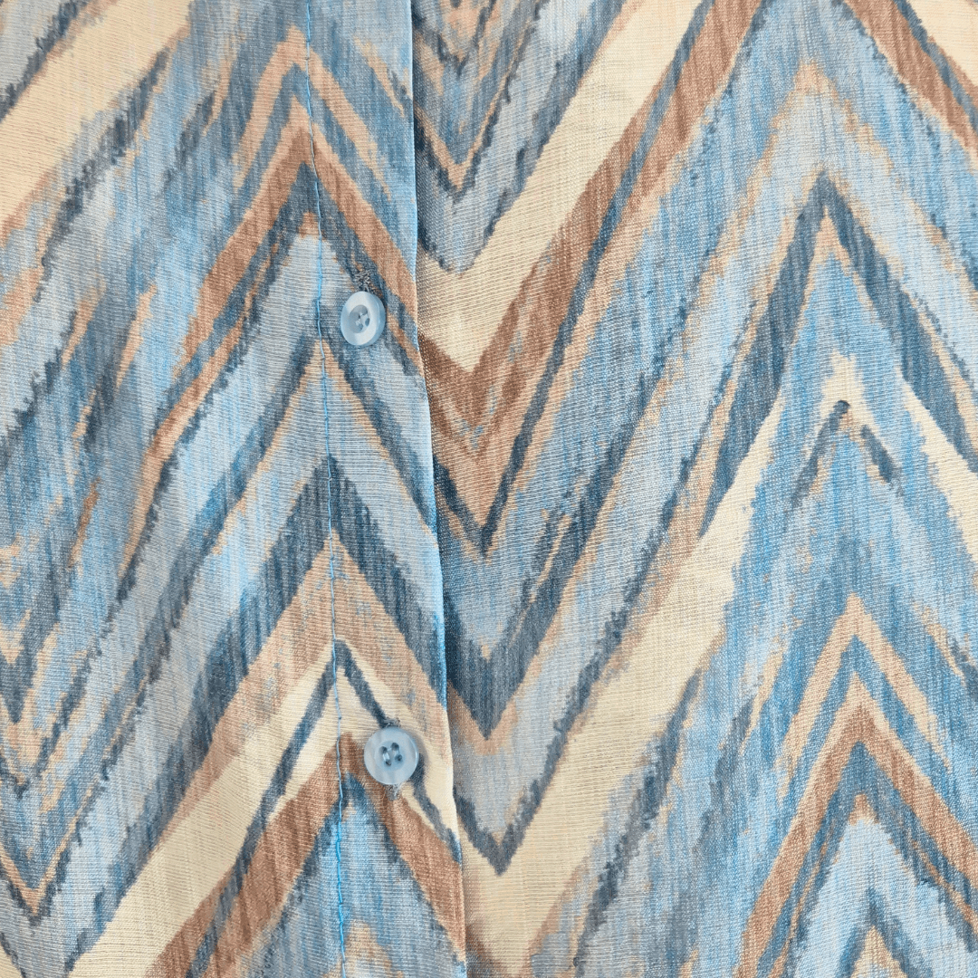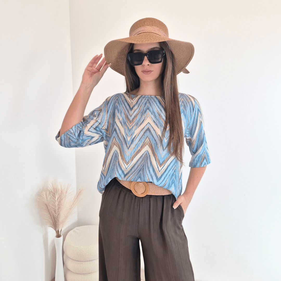 Ženska majica iz kolekcije Violeta v odtenkih modre in bež barve. Ima 3/4 rokava in je na zadnji strani malenkost podaljšana. Na hrbtni strani se zapenja z gumbki. Izdelana je iz viskoze, je lahka in diha. Velikost je univerzalna, primerna za S do L. Vse kose iz kolekcije Violeta lahko med sabo lepo kombinirate.