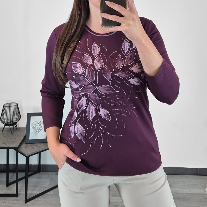 Ženska elegantna majica. Narejena je iz mešanice viskoze in je prijetna za nošenje. Ima 3/4 rokava. Majica je v vijola barvi. Spredaj jo krasi tisk z dodanimi malimi bleščicami, kar daje majici poseben izgled.