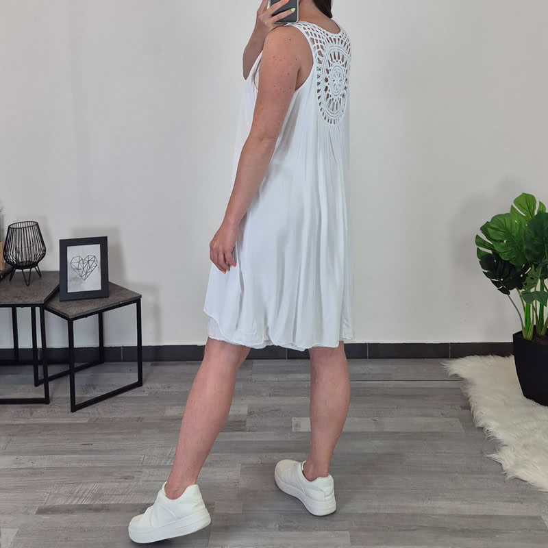Poletna viskozna obleka s čipko na hrbtu.