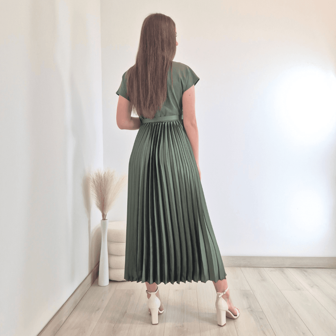 Ženska poletna obleka v olivni barvi. Obleka ima kratka rokava, spodaj jo krasi plise krilo, dodan je dekorativni pas. Izdelana je iz mešanice viskoze in je prijetna za nošenje. Je odlična izbira za poletne dni. Velikost je univerzalna, primerna za S do L.