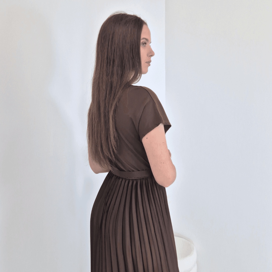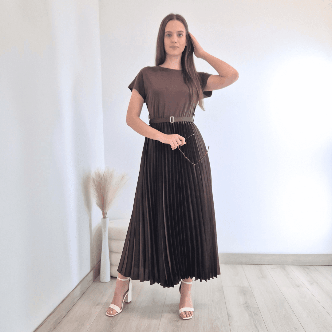Ženska poletna obleka v rjavi barvi. Obleka ima kratka rokava, spodaj jo krasi plise krilo, dodan je dekorativni pas. Izdelana je iz mešanice viskoze in je prijetna za nošenje. Je odlična izbira za poletne dni. Velikost je univerzalna, primerna za S do L.