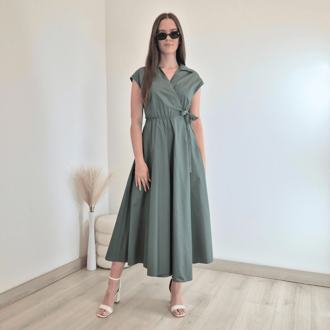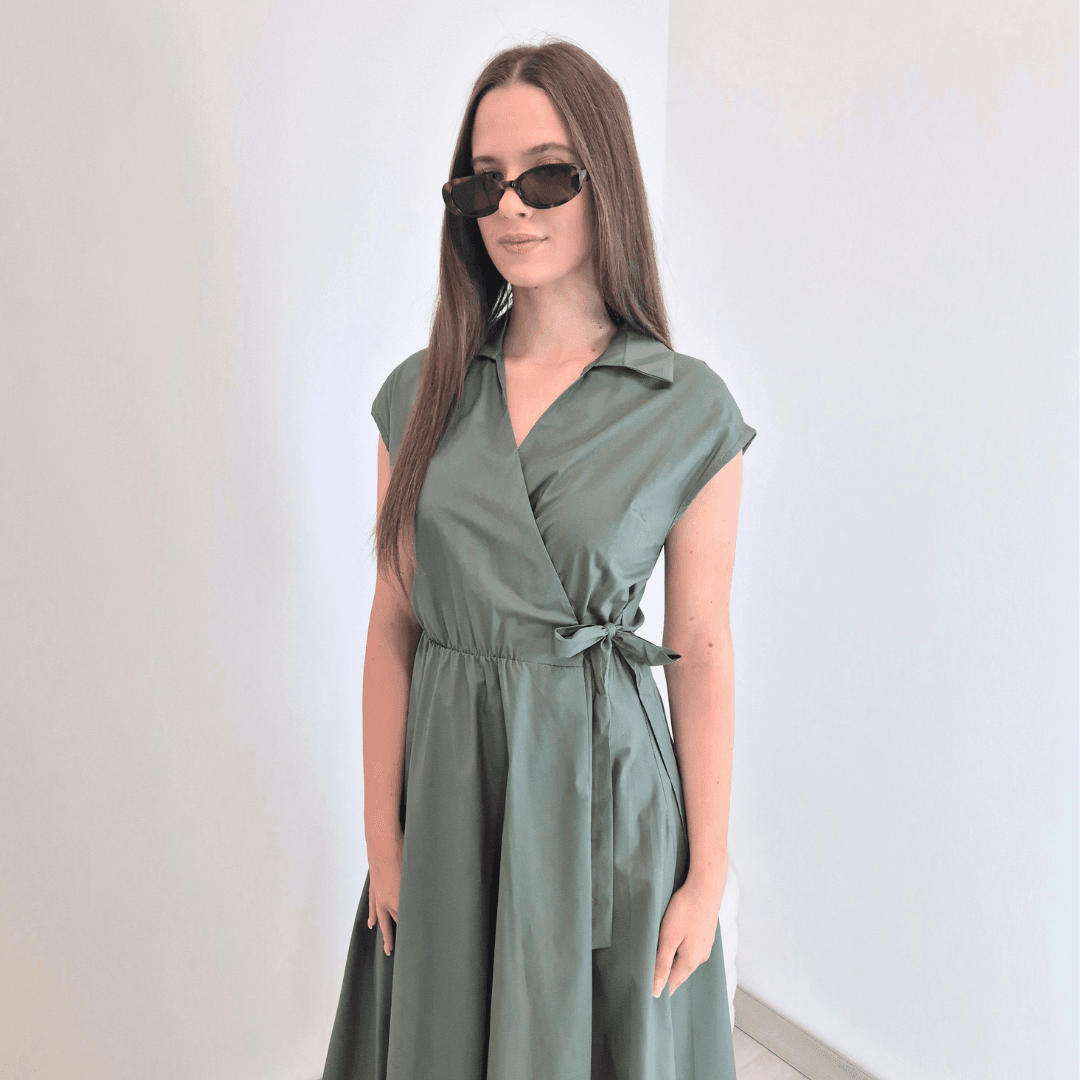 Ženska poletna obleka v olivni barvi. Obleka ima ovratnik, je brez rokav in se zaveže na preklop. Izdelana je iz 100% bombaža, je lahka in diha. Je odlična izbira za vroče poletne dni. Velikost je univerzalna, primerna za S do L.