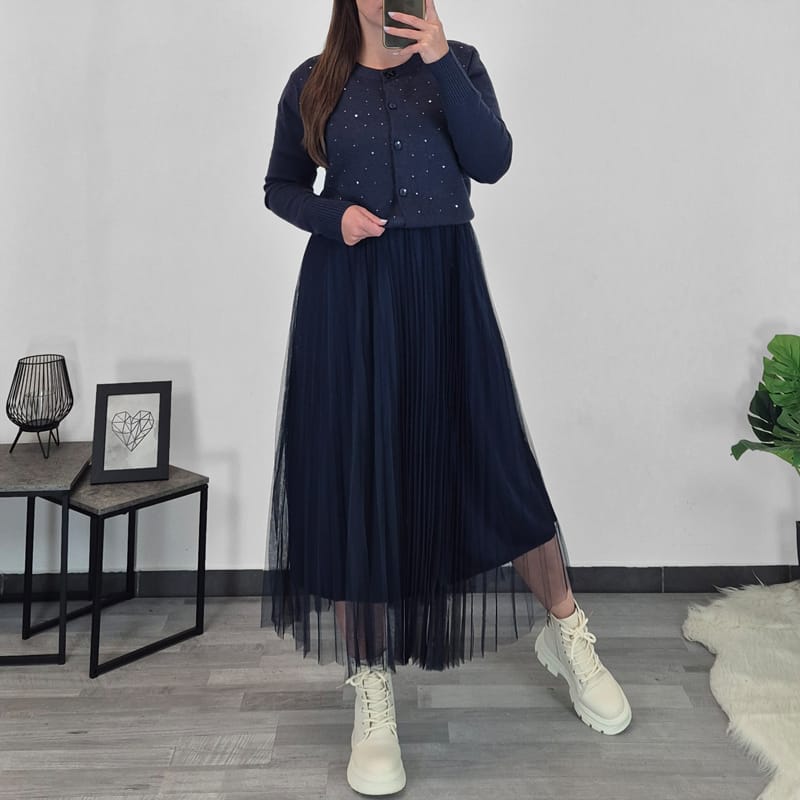 Ženska obleka je sestavljena iz dveh delov. Na spodnji delu je narejena iz plise krila in iz temno modrega topa, zgornji del jo sestavlja pletena temno modra jopica z bleščicami, zapenja se z gumbi. Velikost je univerzalna, primerna za velikosti od S do XL.