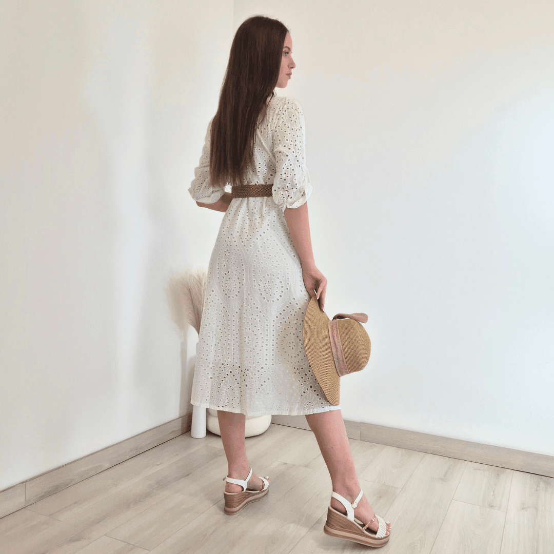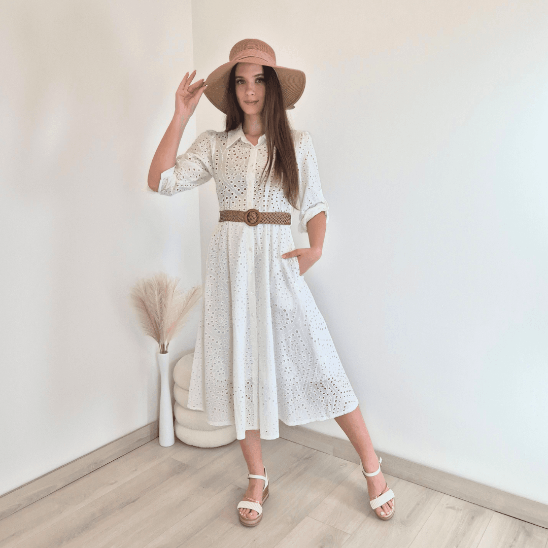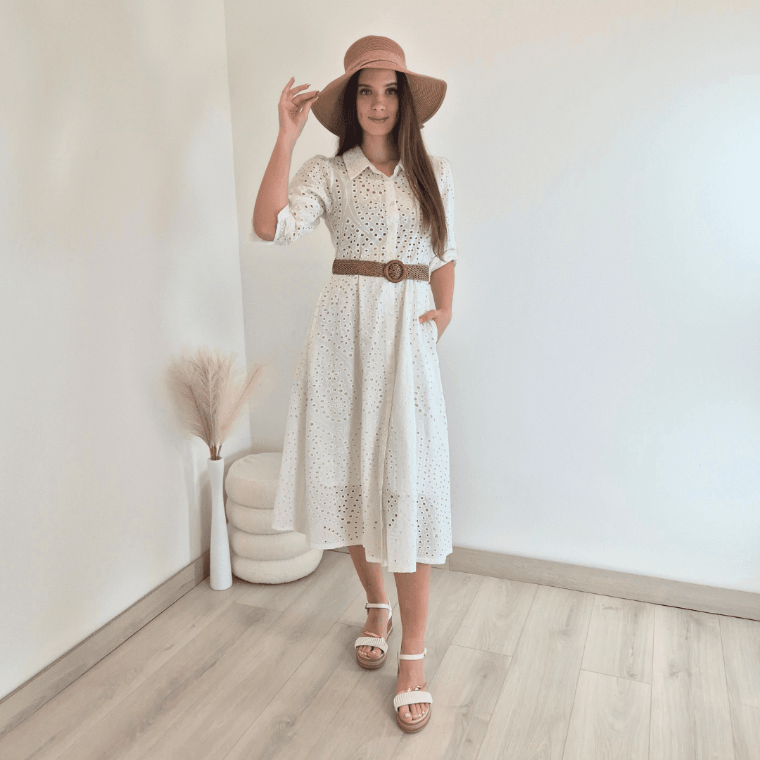 Ženska poletna čipkasta obleka v beli barvi. Obleka ima ovratnik in 3/4 rokava, ki jih lahko po želji zavihate. Dodan je dekorativni pas. Izdelana je iz 100% bombaža, je lahka in diha. Je odlična izbira za vroče poletne dni. Velikost je univerzalna, primerna za S do L.