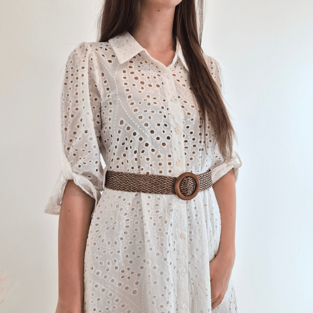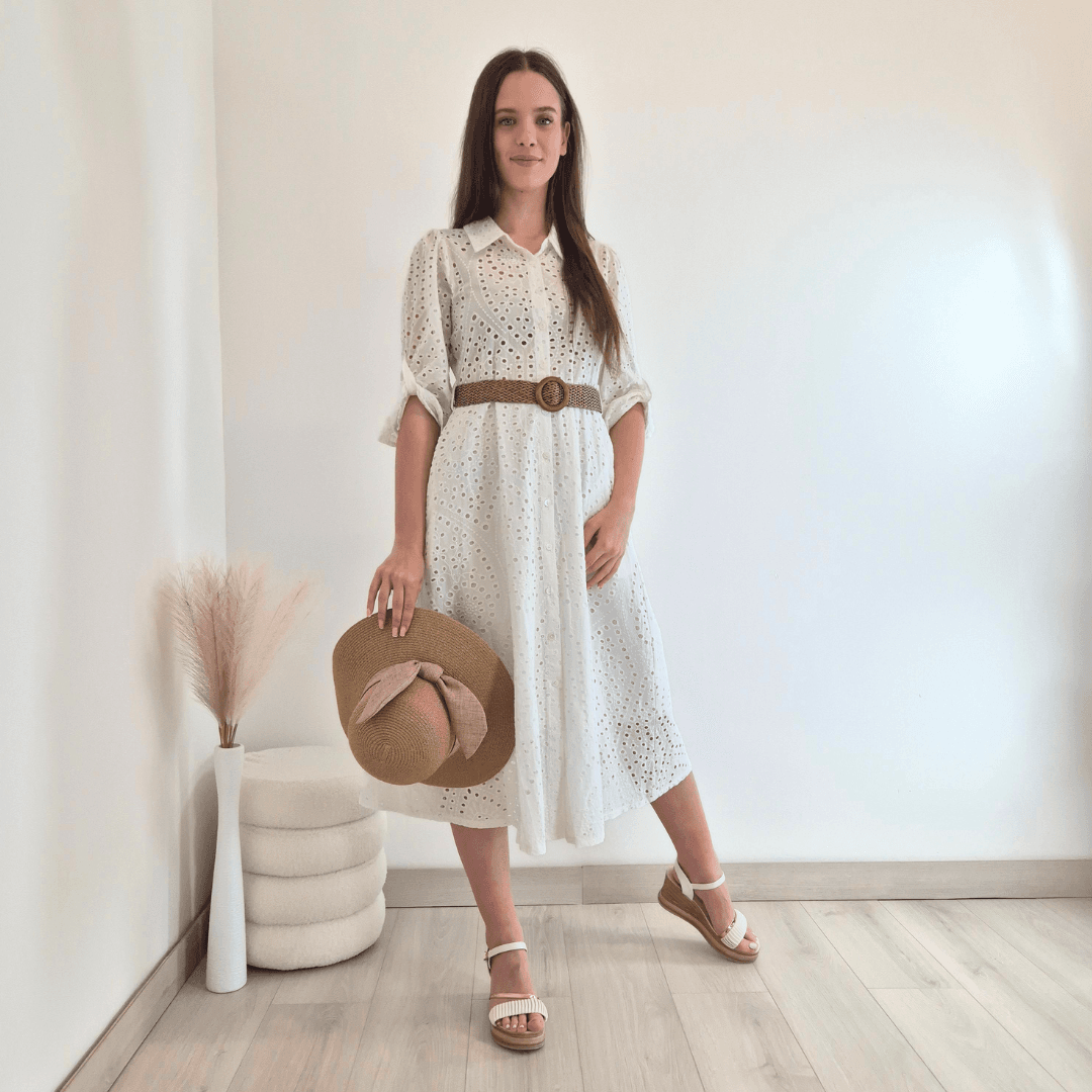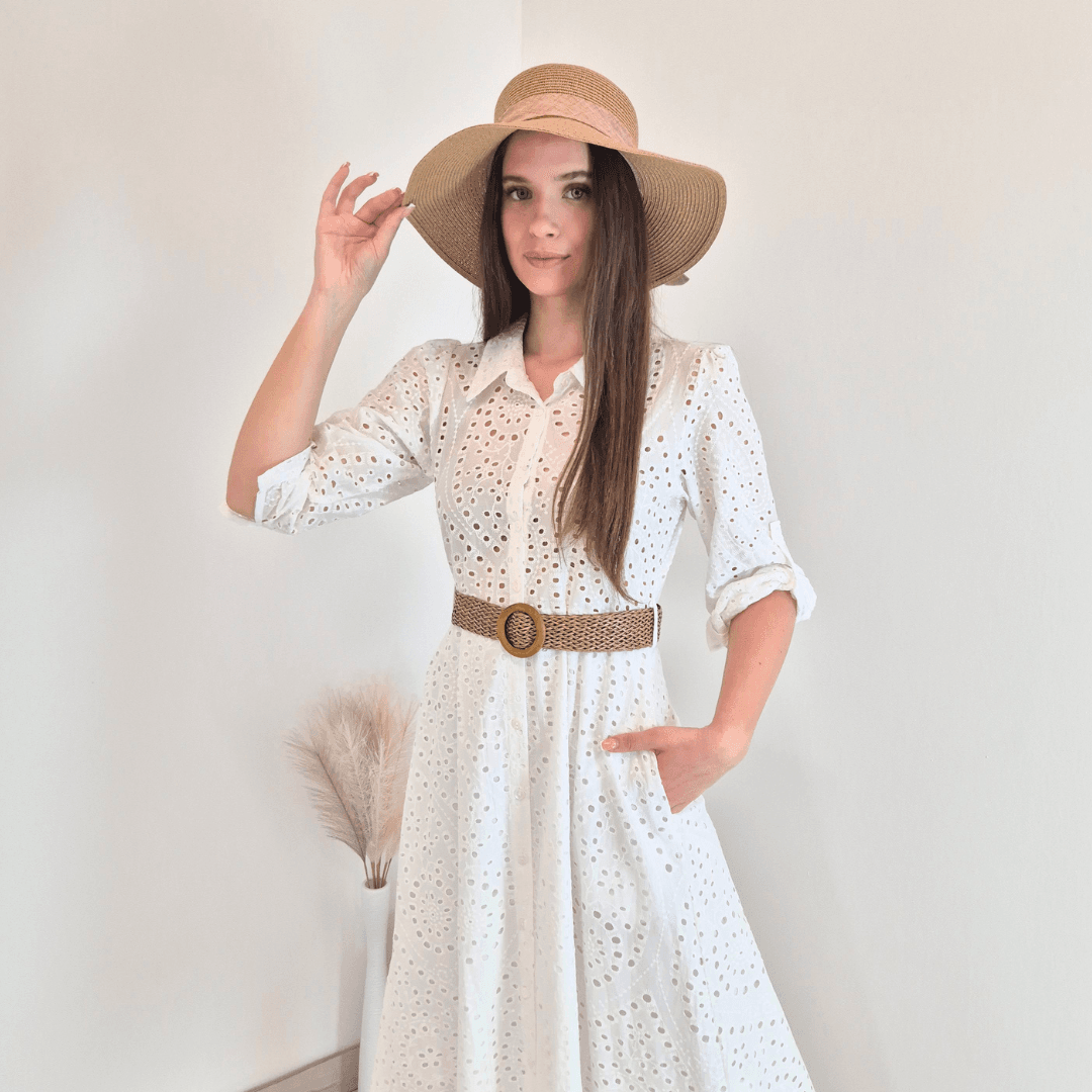 Ženska poletna čipkasta obleka v beli barvi. Obleka ima ovratnik in 3/4 rokava, ki jih lahko po želji zavihate. Dodan je dekorativni pas. Izdelana je iz 100% bombaža, je lahka in diha. Je odlična izbira za vroče poletne dni. Velikost je univerzalna, primerna za S do L.