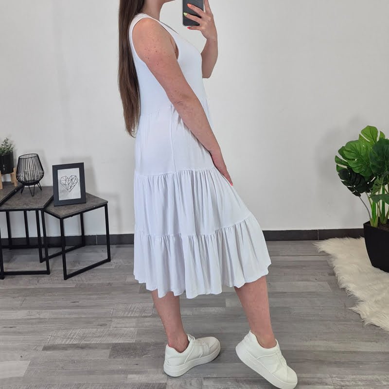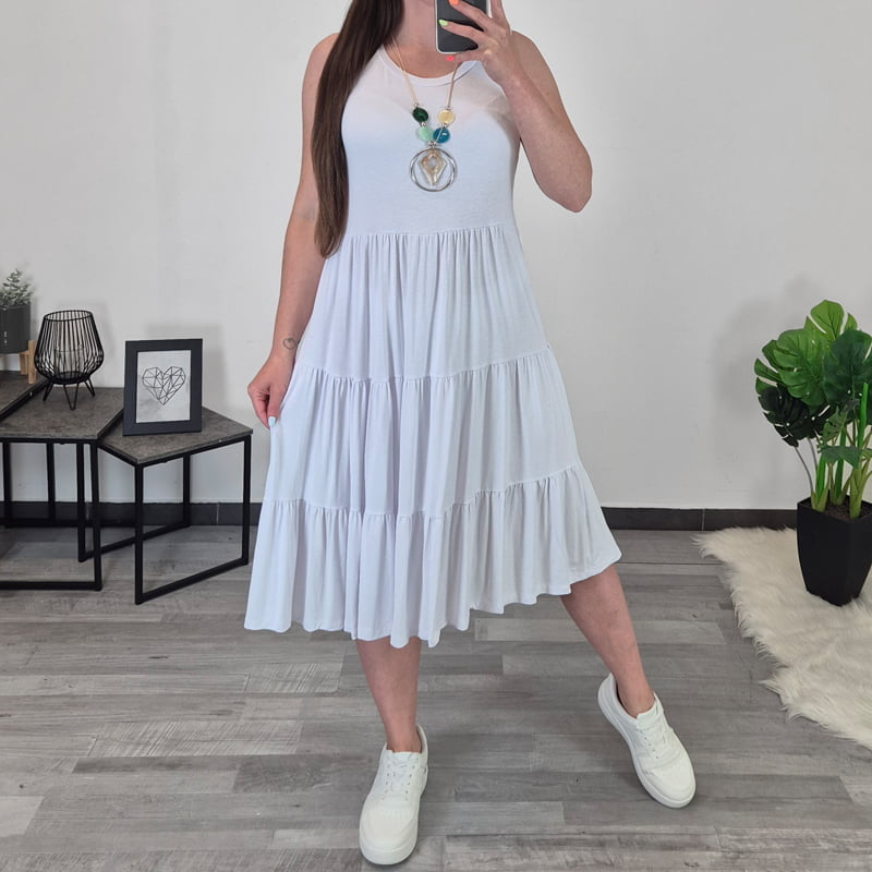 Ženska poletna obleka je izdelana iz viskoze in je prijetna za nošenje. Obleka je brez rokavov s širokimi naramnicami, dodano ima verižico. Velikost je univerzalna, primerna za velikosti S do XL.