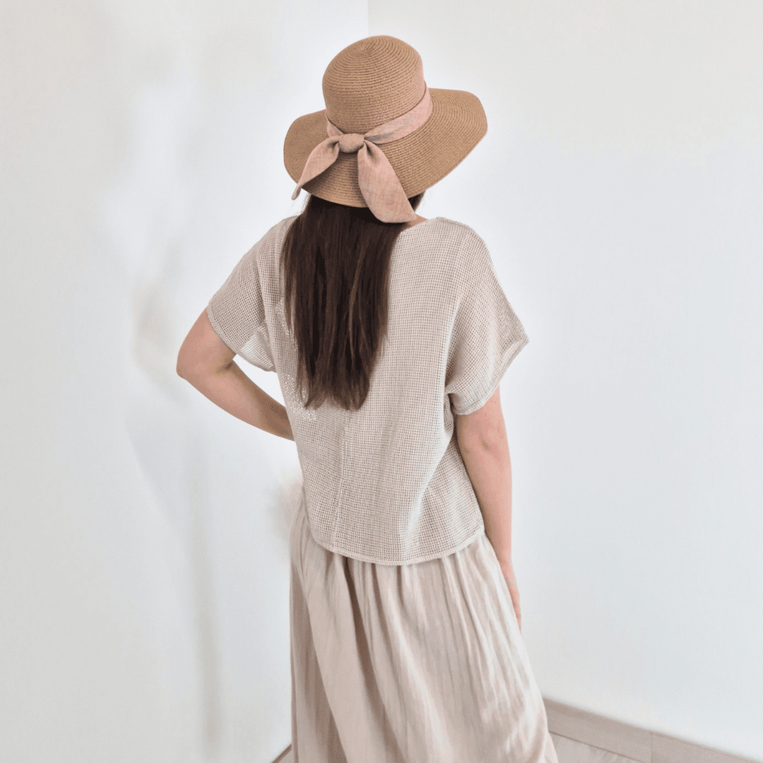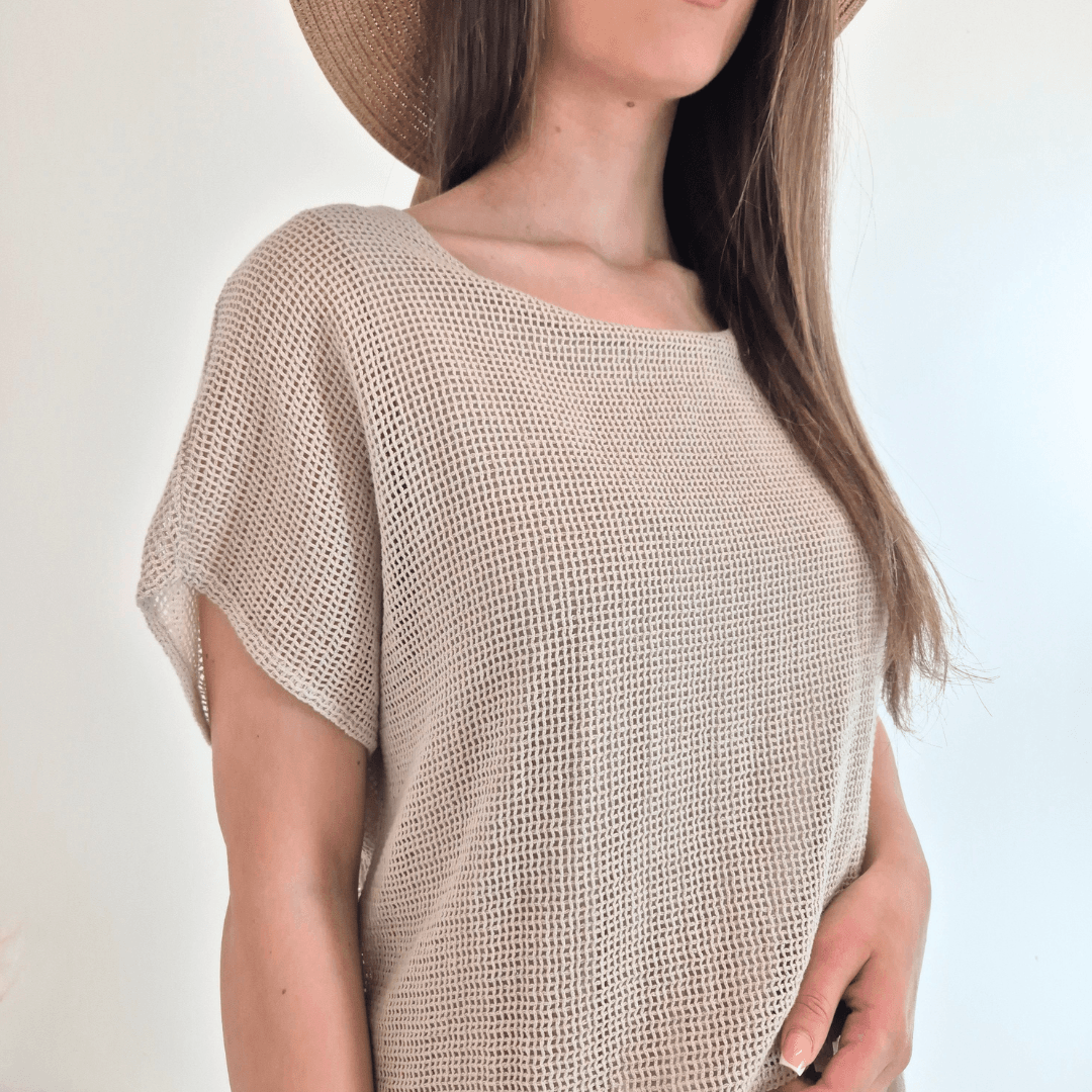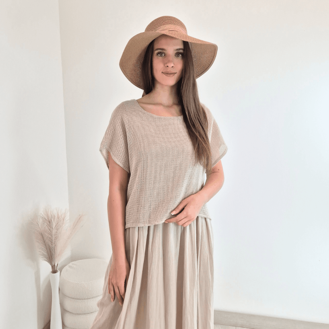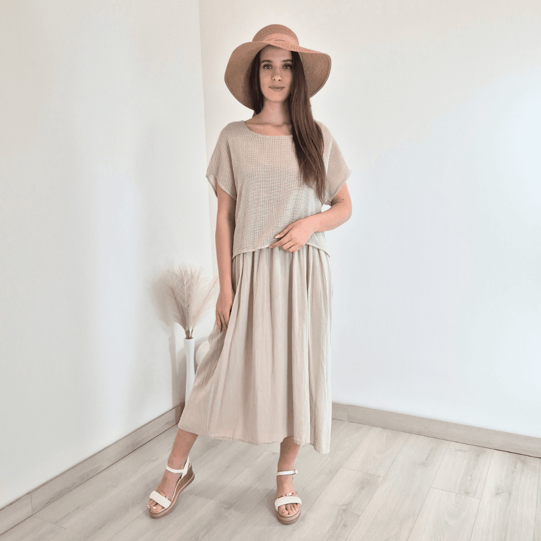 Ženska poletna obleka v bež barvi. Obleka ima v zgornjem delu prišito tanko pletenino, kar ji daje poseben izgled. Izdelana je iz 100% bombaža, je lahka in diha. Je odlična izbira za vroče poletne dni. Velikost je univerzalna, primerna za M do 3XL.