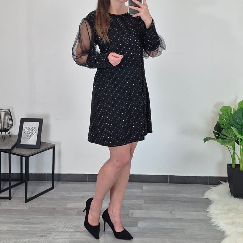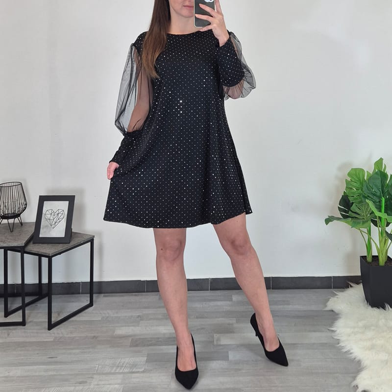 Modna ženska obleka v črni barvi s srebrnimi kamenčki. Obleka ima širša prozorna rokava, zaključena so s patentom. Velikost je univerzalna, primerna od M do XL.