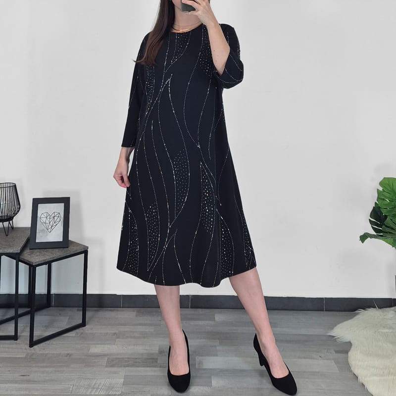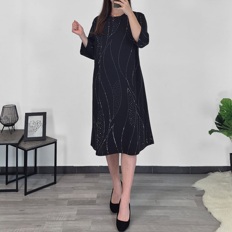Modna elegantna obleka v črni barvi. Obleka ima 3/4 rokava in sega čez kolena. Po celotni površini jo krasijo srebrni biserčki. Velikost je univerzalna, primerna za 48 do 54.