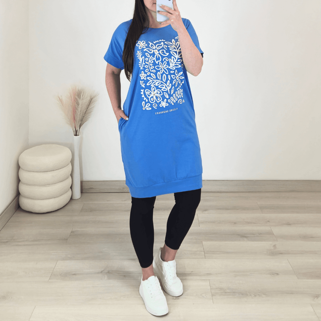 Ženska poletna obleka ali tunika v modri barvi. Obleka je narejena iz mešanice bombaža, zato je lahka in prijetna za nošenje. Kroj je širši, ima dva žepa. Spredaj ima tisk. Na voljo v velikosti S/M in L/XL. Velikost S/M=40/42, L/XL=44/46