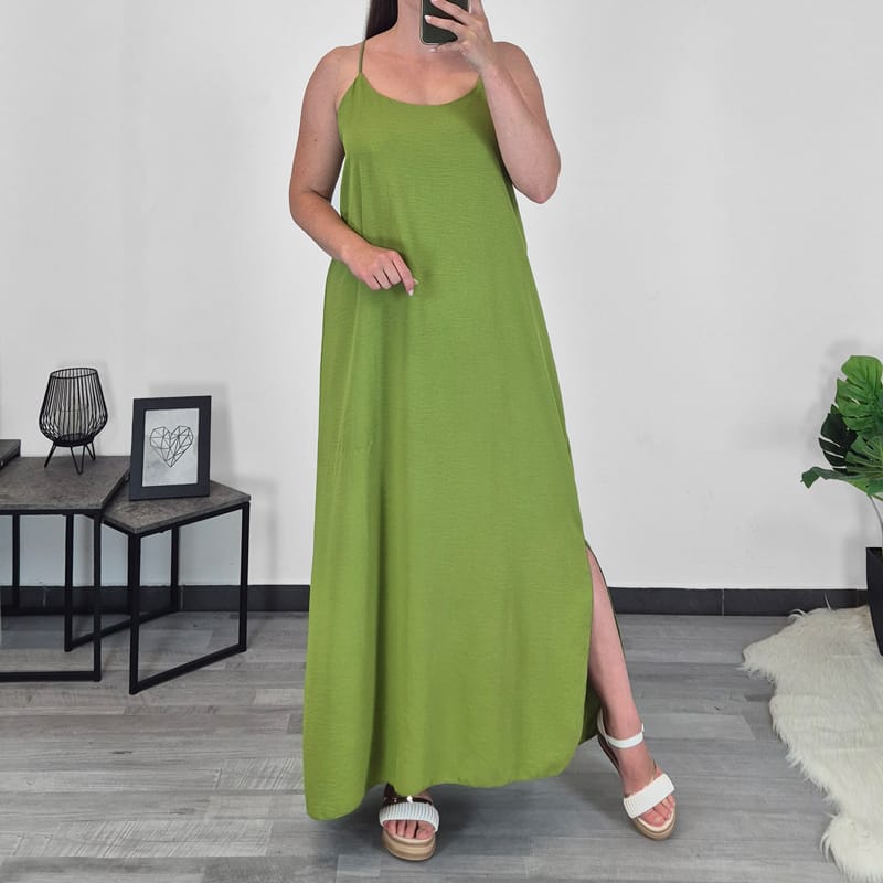 Dolga ženska elegantna obleka v zeleni barvi. Obleka ima ozke naramnice, ki se križajo na hrbtu. Narejena je iz gladkega materiala, ki lepo pade, na spodnjem delu je dodan razporek. Velikost je univerzalna, primerna za velikosti od S do XL.
