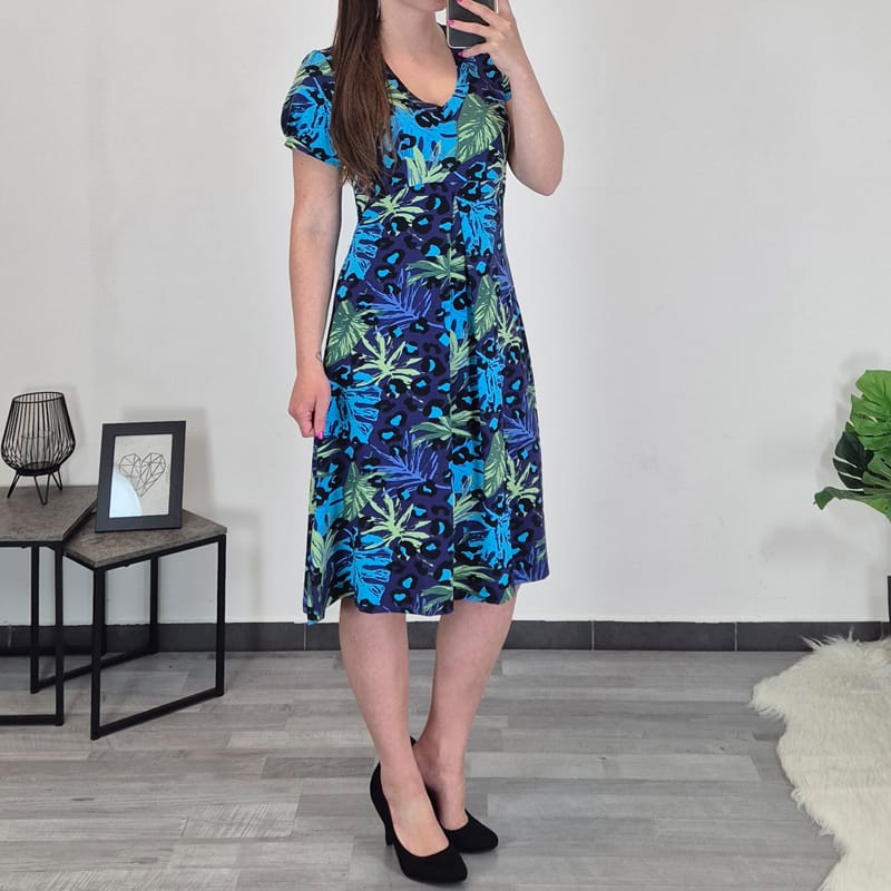 Modna ženska obleka v kombinaciji modre, črne in zelene. Obleka ima kratka rokava in V izrez. V predelu prsi je rahlo oprijeta potem pa krojena navzven. Izdelana je iz kvalitetne viskoze, zato diha in lepo pade. Na voljo od številke S do XXL.