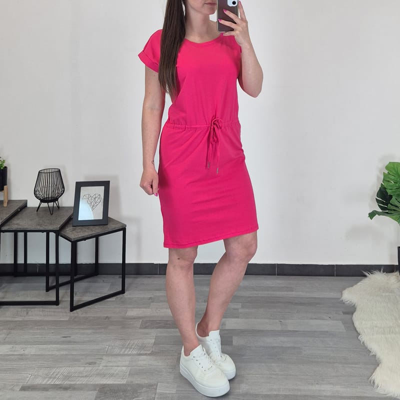 Modna ženska obleka v roza barvi. Obleka ima kratka rokava, pod prsmi je dodana vrvica s katero lahko poljubno nastavite širino. Izdelana je iz kvalitetnega bombaža in je prijetna za nošenje. Na voljo od številke S do XXXL.