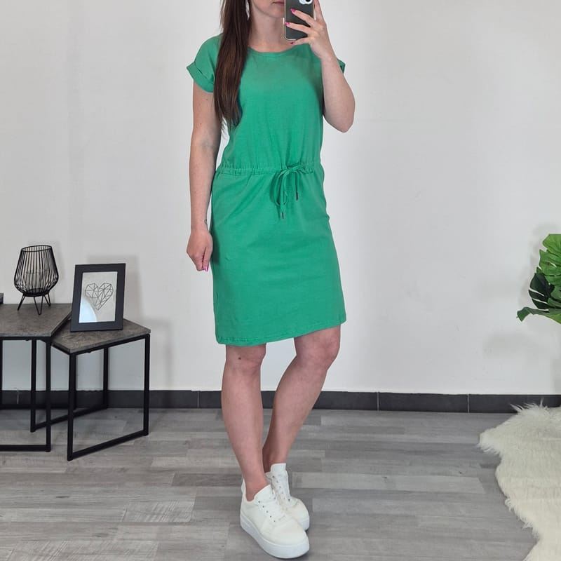 Modna ženska obleka v zeleni barvi. Obleka ima kratka rokava, pod prsmi je dodana vrvica s katero lahko poljubno nastavite širino. Izdelana je iz kvalitetnega bombaža in je prijetna za nošenje. Na voljo od številke S do XXL.