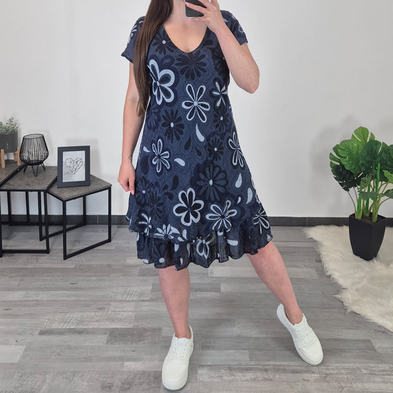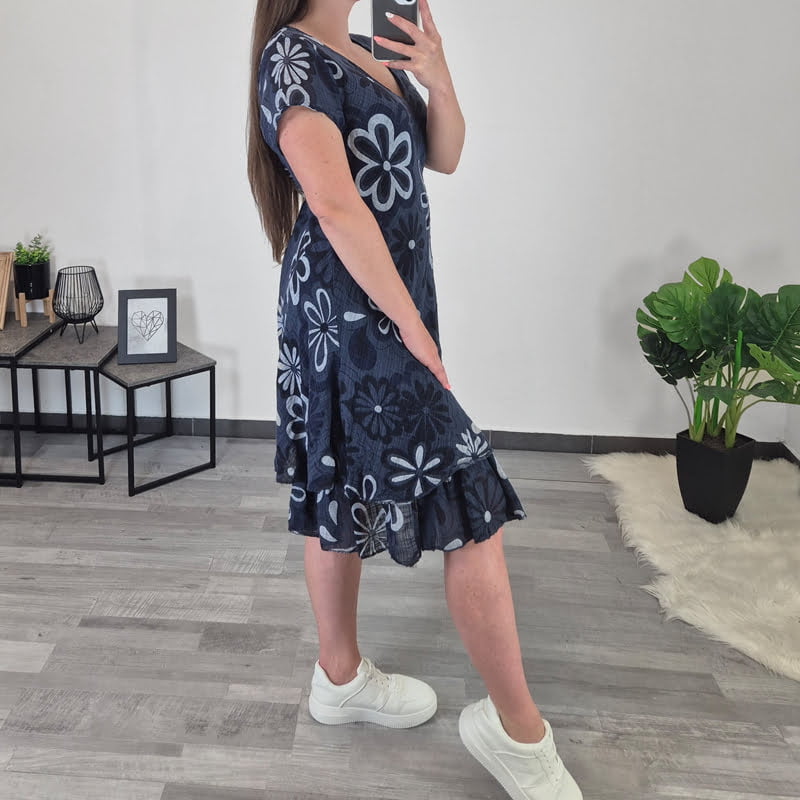 Ženska poletna obleka s kratkimi rokavi v temno modri barvi. Obleka je asimetrična, krojena je na ‘A’, v prsih ožja in spodaj širša. Narejena je iz mešanice viskoze in bombaža. Velikost je univerzalna, primerna za M, L, XL.