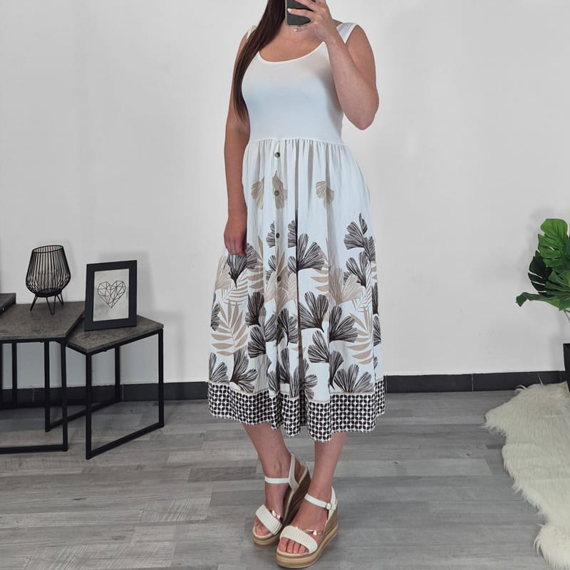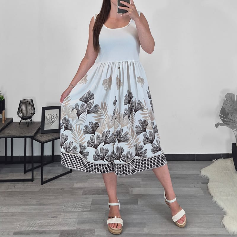 Ženska poletna obleka je izdelana iz mešanice viskoze in bombaža, zato je prijetna za nošenje. Obleka je brez rokavov s širokimi naramnicami. Zgornji del je enobarven, od pasu navzdol pa je krilo pisano v rjavem zeleni in bež vzorčku z malimi dekorativnimi gumbi. Velikost je univerzalna, primerna za velikosti S do XL.
