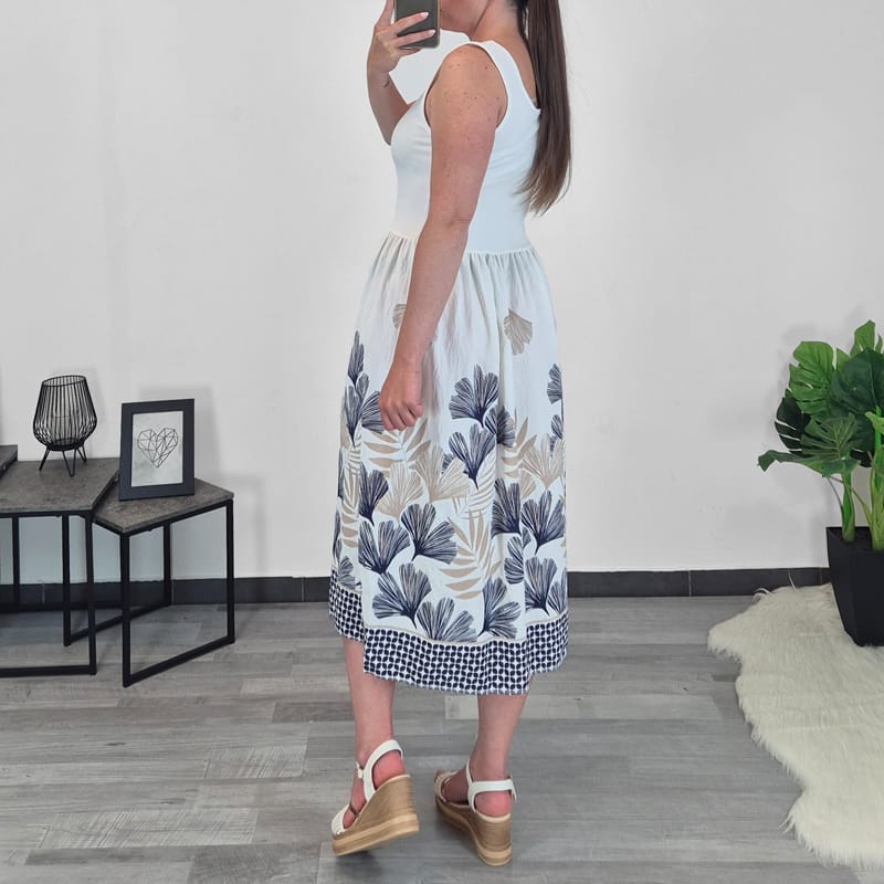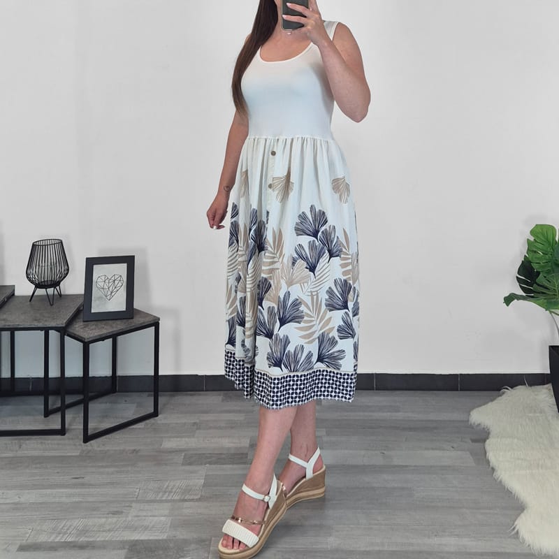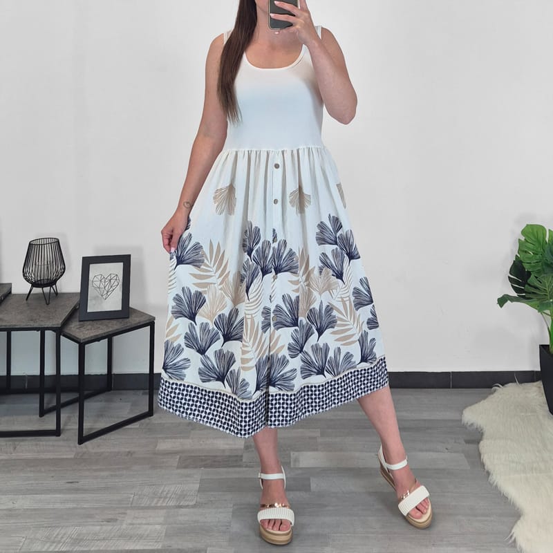 Ženska poletna obleka je izdelana iz mešanice viskoze in bombaža, zato je prijetna za nošenje. Obleka je brez rokavov s širokimi naramnicami. Zgornji del je enobarven, od pasu navzdol pa je krilo pisano v temno modrem in bež vzorčku z malimi dekorativnimi gumbi. Velikost je univerzalna, primerna za velikosti S do XL.