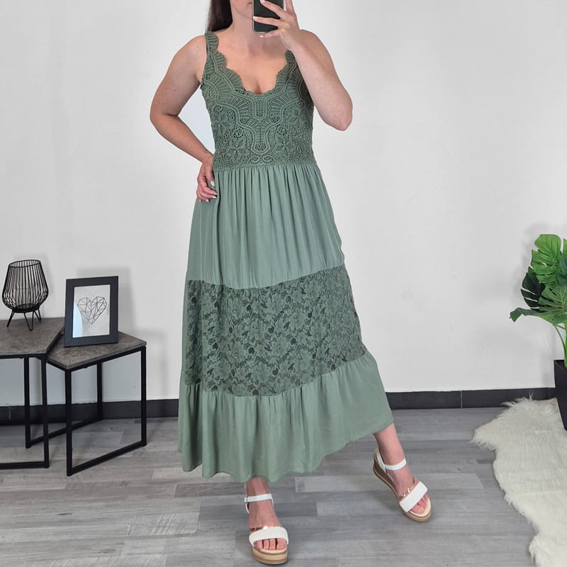 Dolga ženska poletna obleka v olivno zeleni barvi. Obleka je narejena iz čipke in iz gladke viskoze. Obleka je univerzalna, primerna za velikost S, M, L in XL.