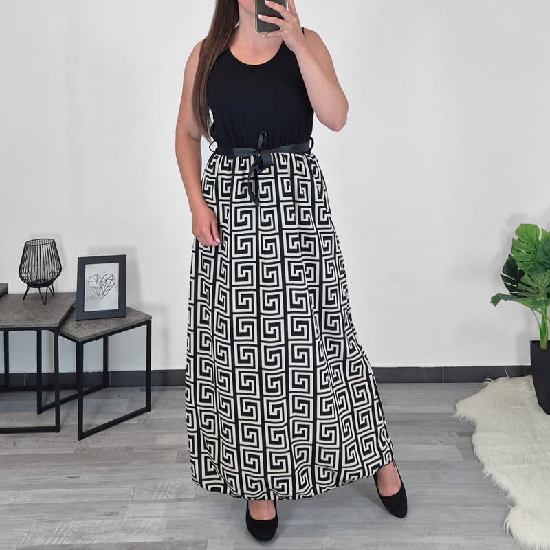 Modna ženska obleka v črni barvi. Obleka je dolga, ima ozke naramnice. Zgoraj je enobarvna črna, od pasu navzdol pa je blago v črno bež kombinaciji. Velikost je univerzalna, primerna za S, M in L.