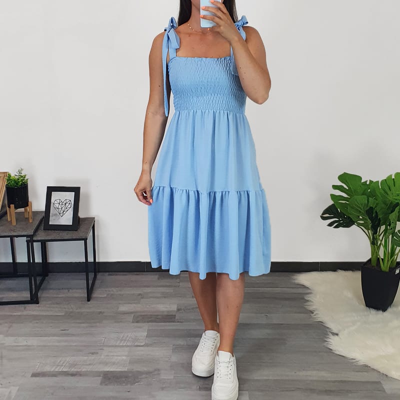 Ženska poletna obleka v modri barvi. Obleka je brez rokav, z naramnicami, ki se zavežejo. Velikost je univerzalna, primerna za S, M, L in XL.