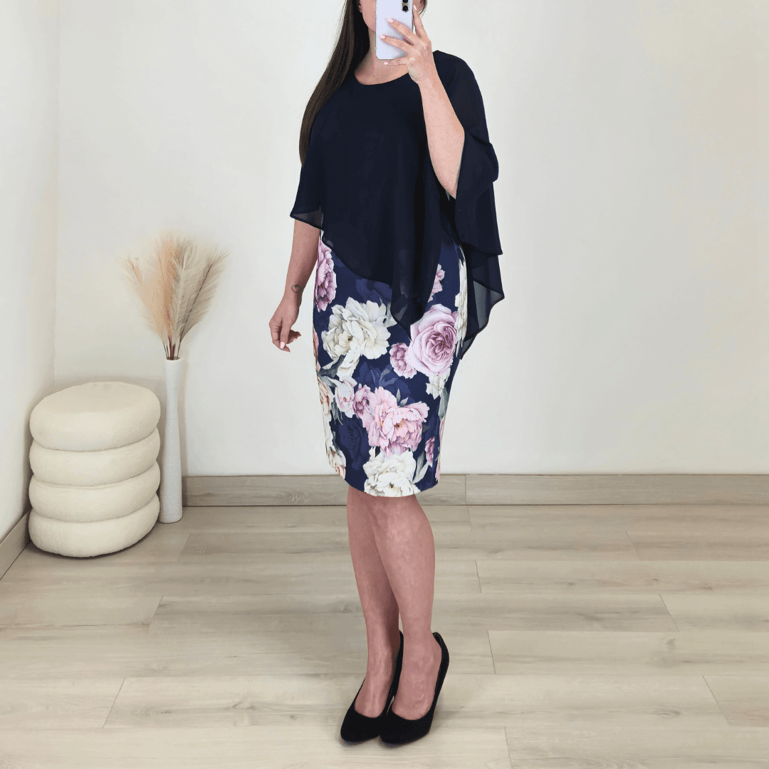 Ženska elegantna obleka Chloe s padajočim muslinom, ki je pritrjen na osnovo. Zelo je primerna tudi za močnejše postave. Osnova obleke je v temno modri barvi z vzorcem pisanih rož, muslin pa je v temno modri barvi. Na voljo v velikostih od 38 do 48.